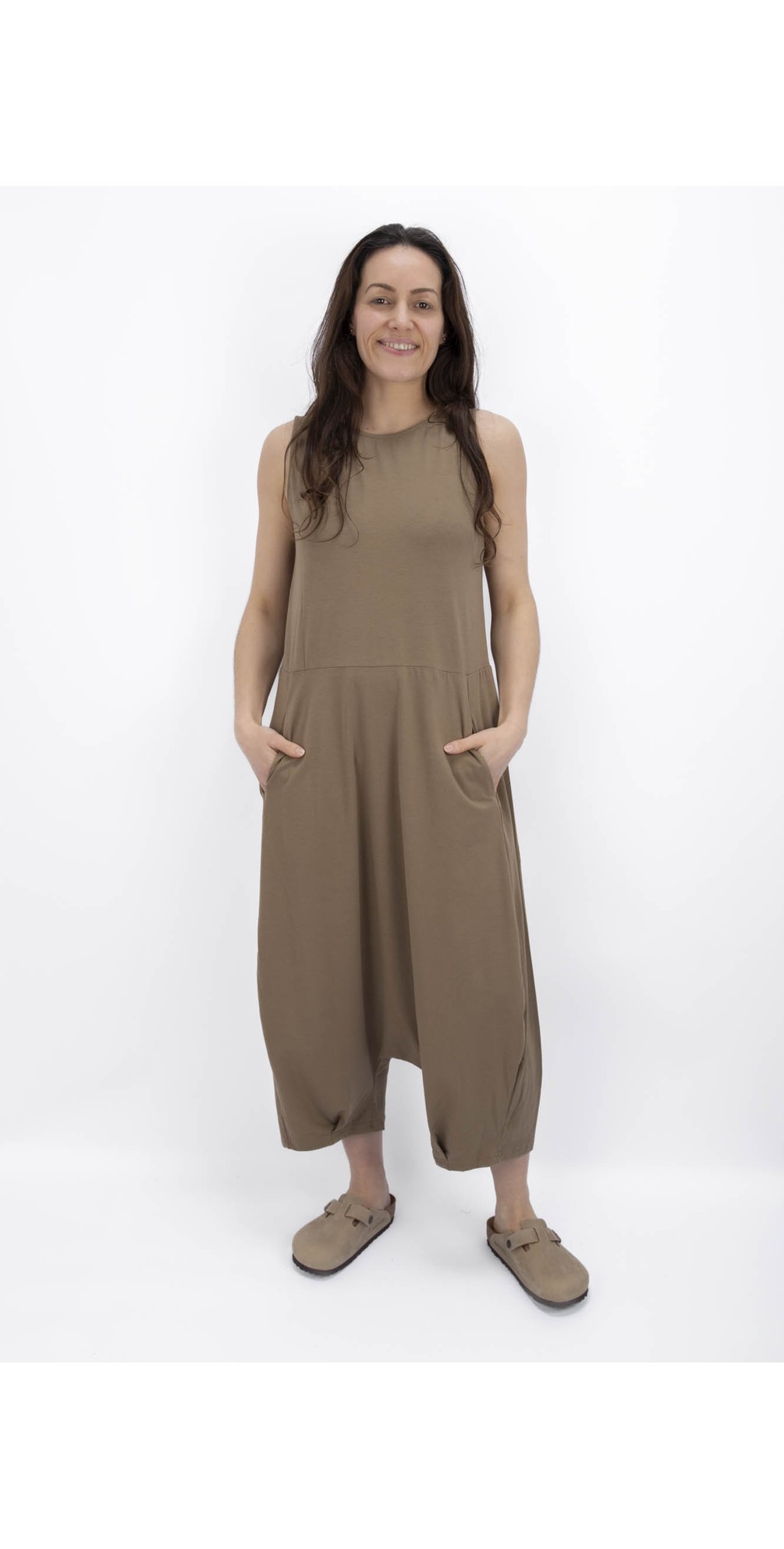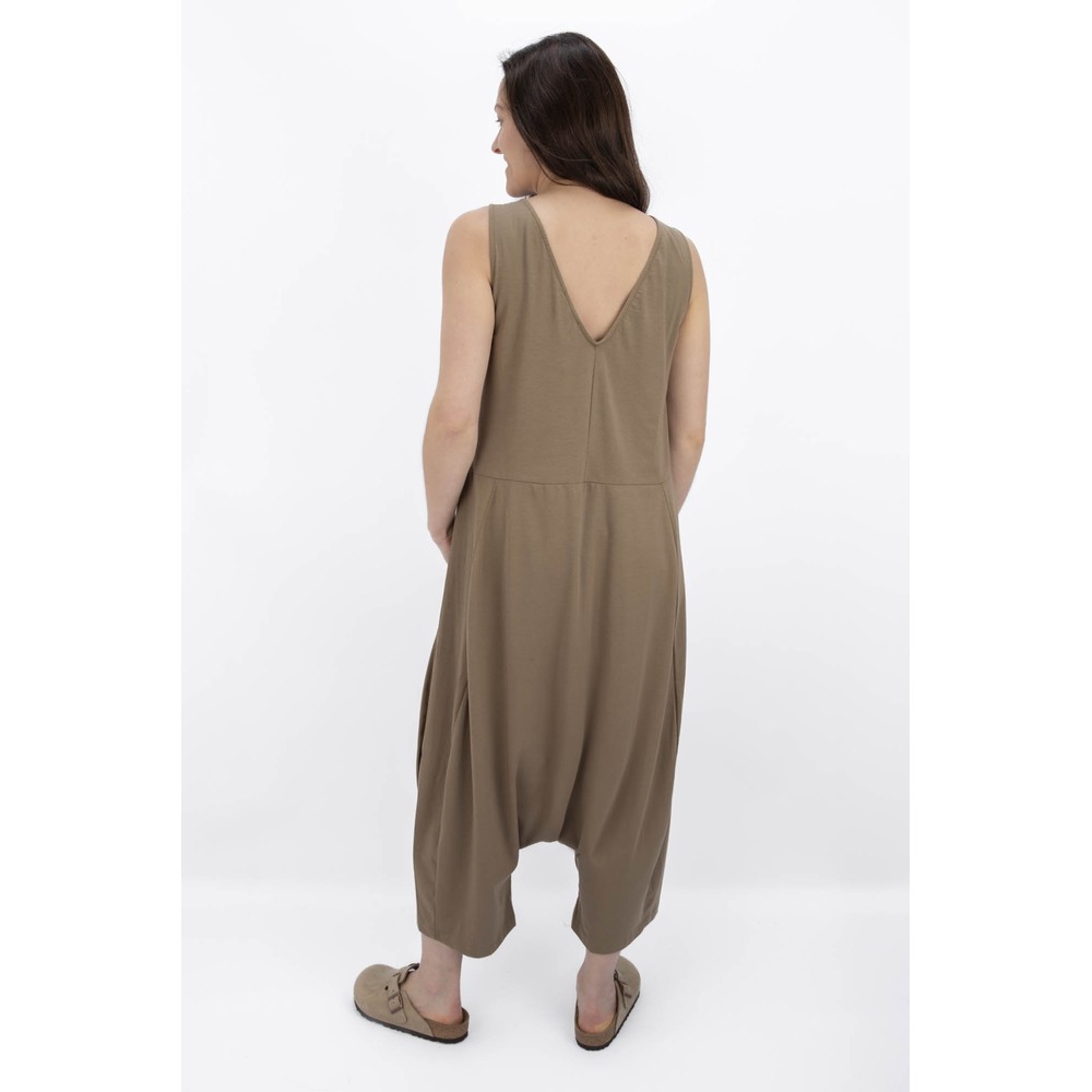 The Mama B IOS U Jumpsuit is a sleeveless design featuring a round neck at the front and stylish V-neckline at the back, and handy side pockets. Super comfortable to wear, this all-in-one has a low-drop crotch and is made from Mama B's signature cotton blend.
