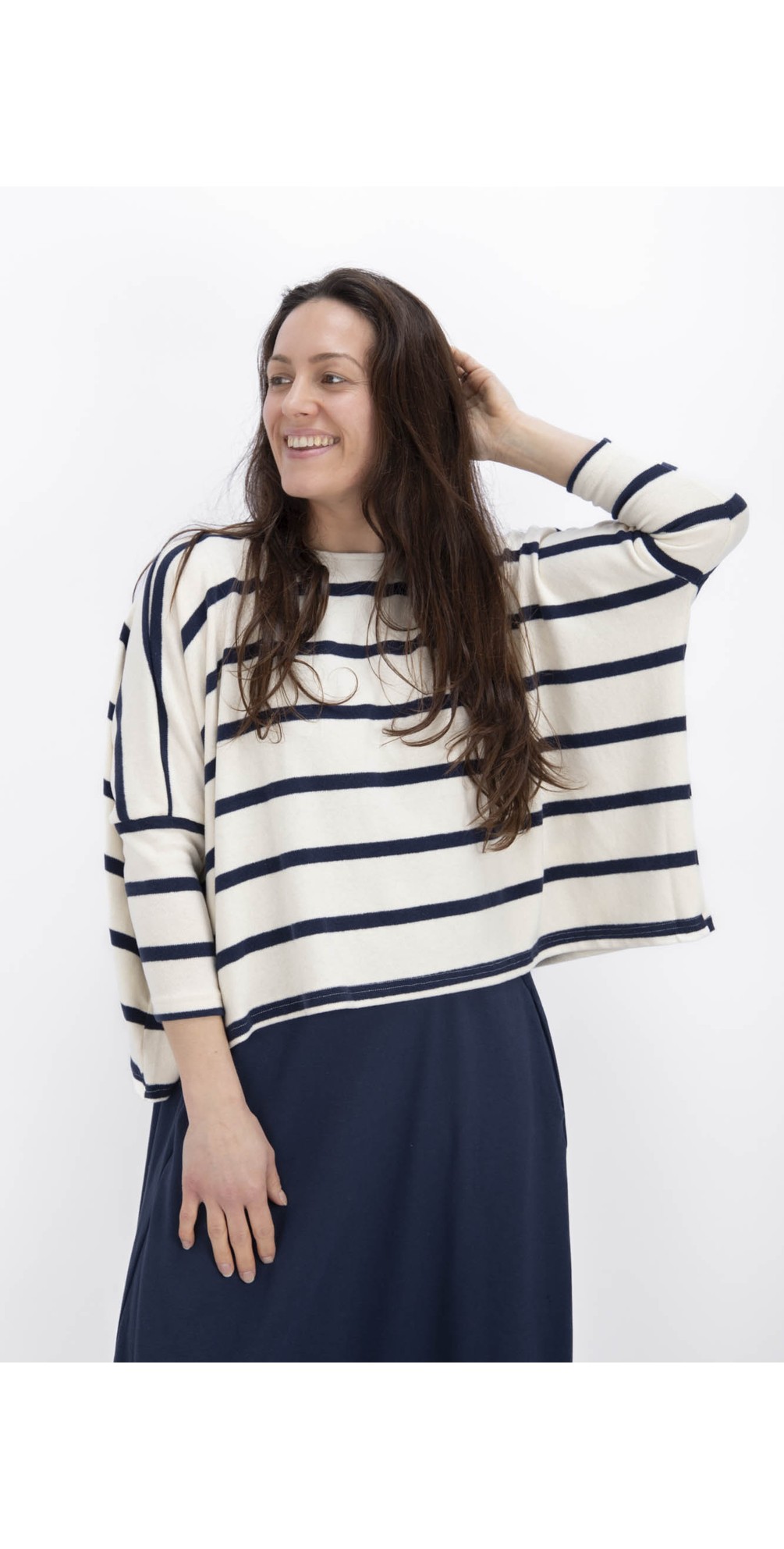 This boxy knit is the Kira M Striped Crop Jumper by Mama B, crafted in a lightweight viscose linen jersey fabric. Designed with a cropped wide silhouette and drop-shoulder seams which create a relaxed fall on the body. Other details to note are the fitted three-quarter-length sleeves and flattering boat neckline.
