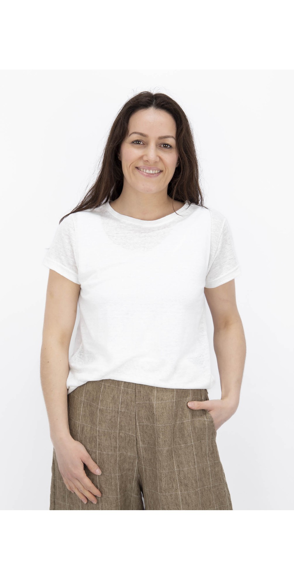 Soft and breathable, it offers an easy silhouette that drapes naturally over the body for all-day wear. The round neckline and short sleeves create a clean, timeless shape, making it perfect for layering or styling with linen trousers for a coordinated, effortless look. Linen pieces like this are ideal for warmer weather, offering both comfort and understated elegance.