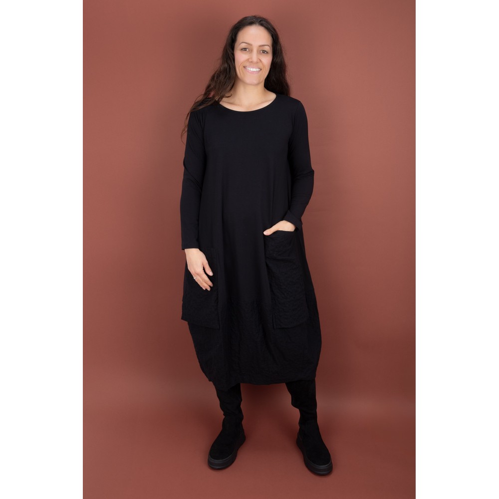 Introducing from Mama B, the Metti SU Woven Insert Dress. Featuring large front pockets, a relaxed fit, and full-length sleeves, it is perfect for the cooler seasons. Style with a statement necklace and boots to elevate the outfit.