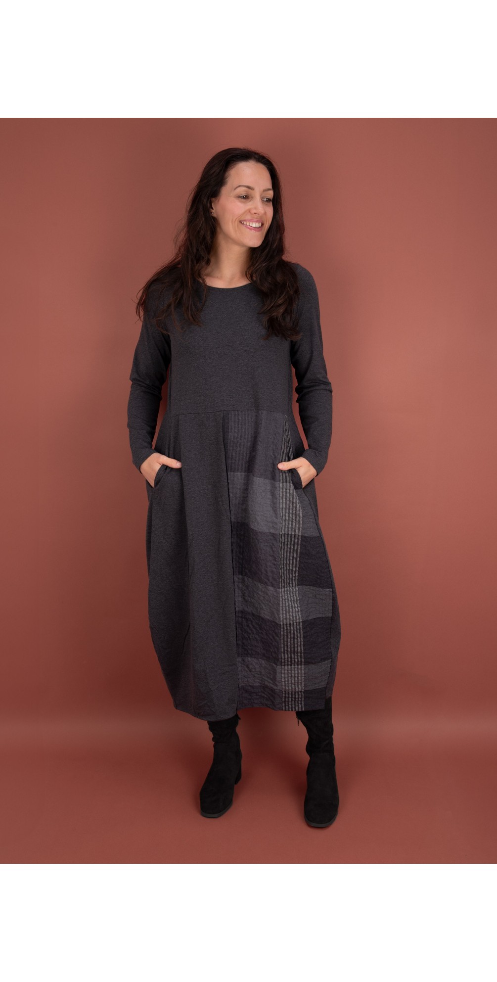The Mia S Check Insert Dress from Mama B brings a modern twist to effortless everyday dressing. Designed with a tulip-shaped skirt, it features a soft round neckline, long sleeves, and practical side seam pockets. A contrasting check fabric panel on one side adds a unique, eye-catching detail that elevates this simple silhouette. Perfect for relaxed styling, this versatile dress works beautifully with boots or layered under a cosy cardigan for the cooler seasons.