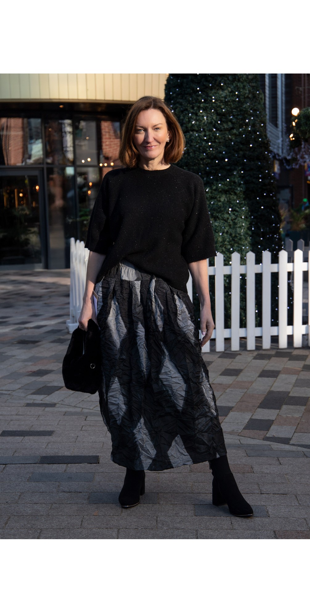 Adding textures to your wardrobe can help to elevate your capsule collection to new heights! The unique crushed fabric on the Orto Trist Antracite Tring Crush Full Skirt from Mama B can be styled with knits and tops alike, we like it best teamed with the Nero Kira Knit.
