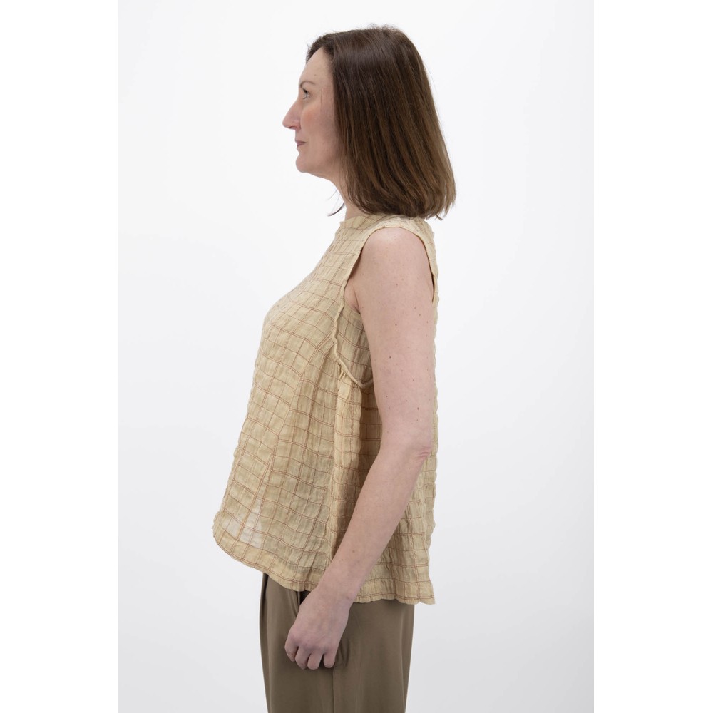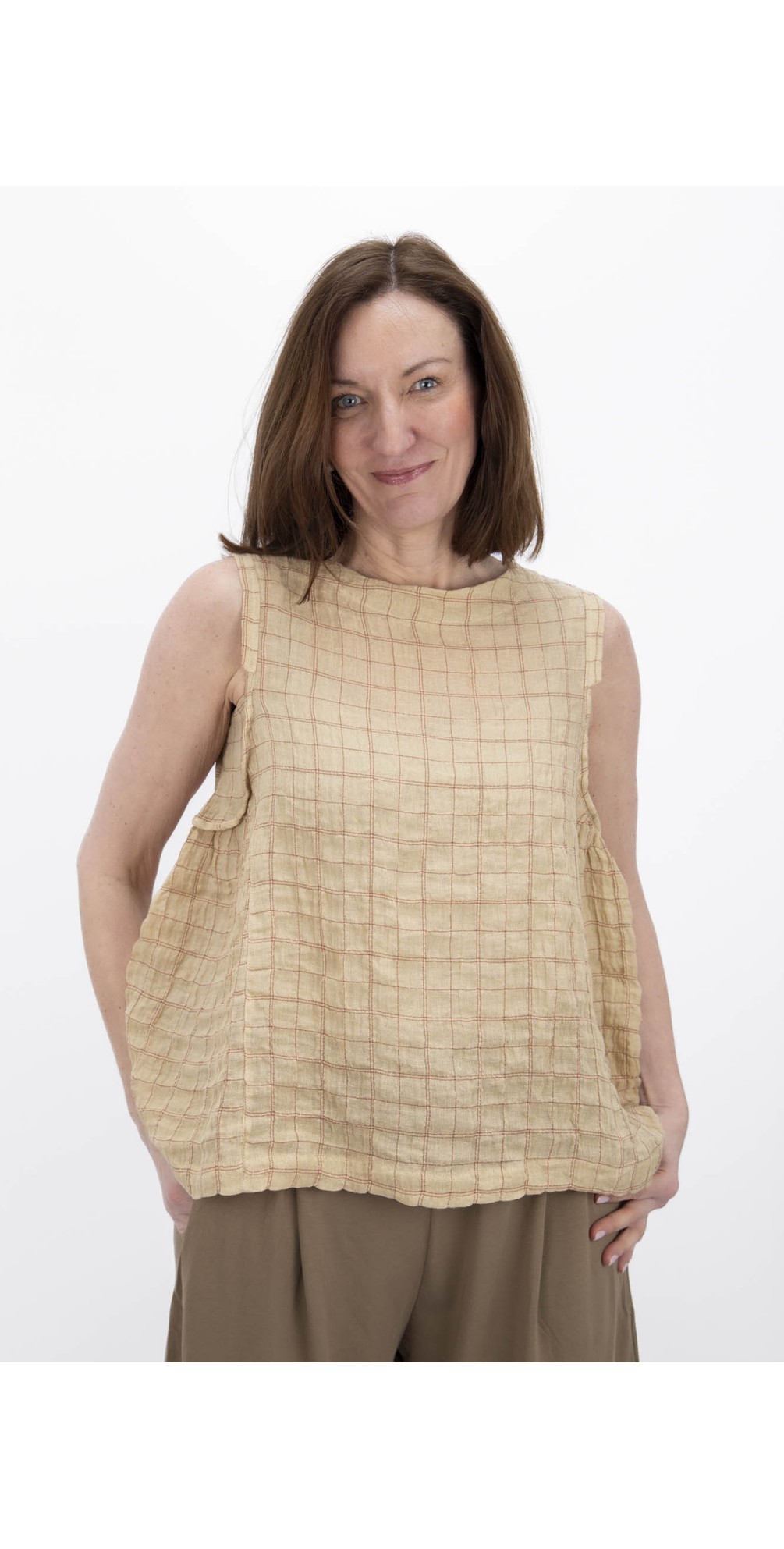 The Pupi Crinkle Linen Top from Mama B is a lightweight and contemporary piece designed for effortless summer styling. Crafted from semi-sheer crinkle linen, this women’s sleeveless linen top features a subtle check print that adds texture and visual interest while maintaining a relaxed, modern look.