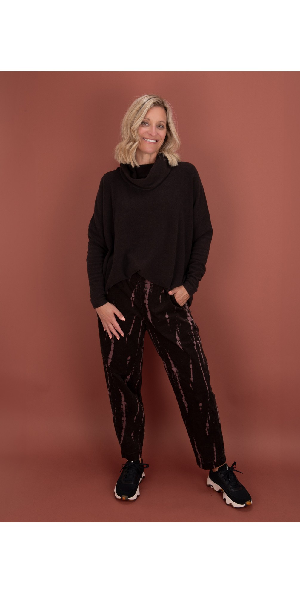 The Terra PR Velvet Trouser from Mama B Is an Autumn stape. A tie-dye printed Straight leg trouser, with front pockets. Style wth a jumper for the ultimate comfort ,and bonus points if it is from Mama B.