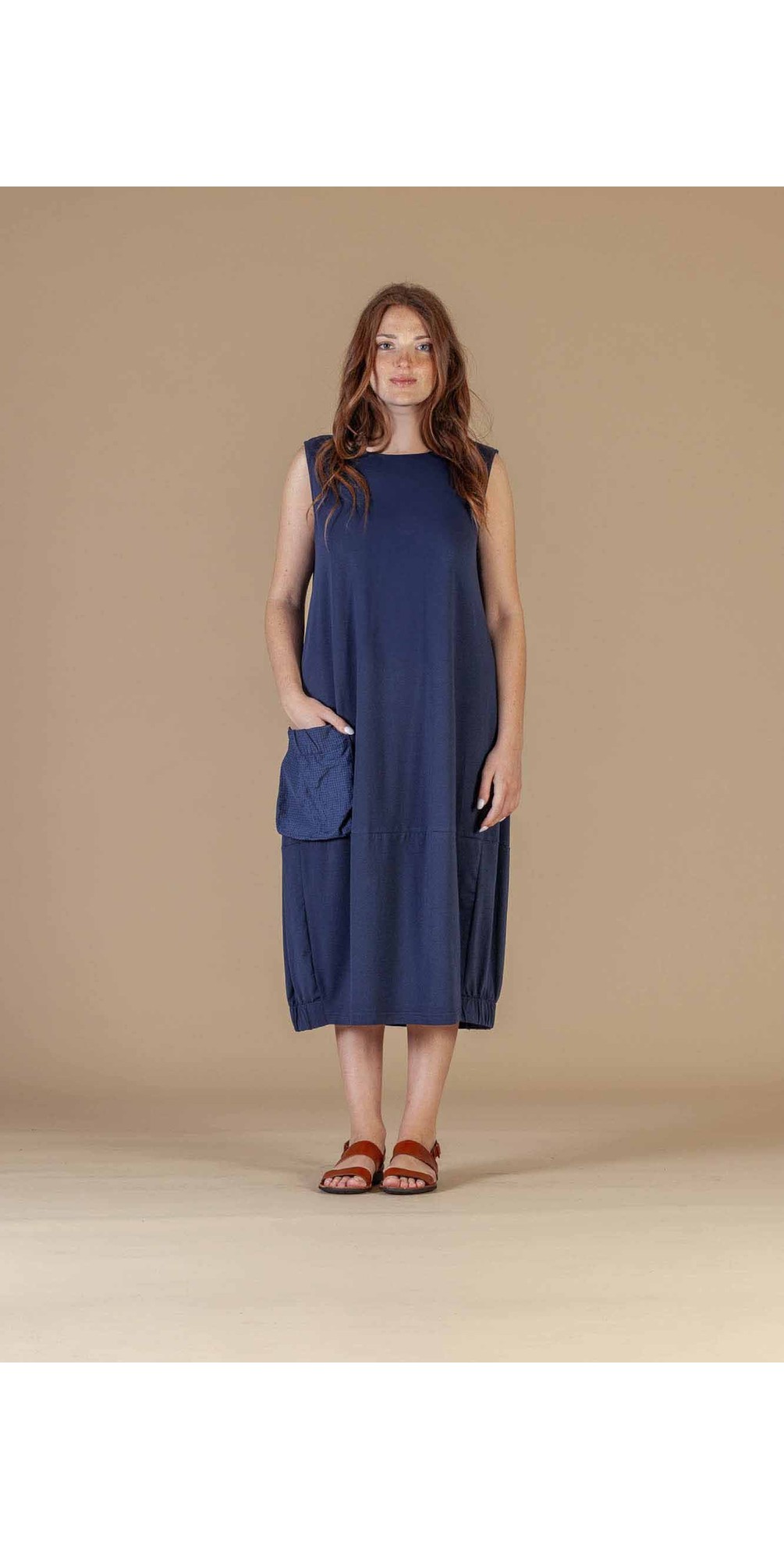 The dress is finished with a contrast front pocket, adding subtle texture and a contemporary detail that reflects Mama B’s distinctive design aesthetic. An elasticated hemline creates a softly shaped silhouette, giving the dress gentle structure while maintaining its relaxed, comfortable fit.