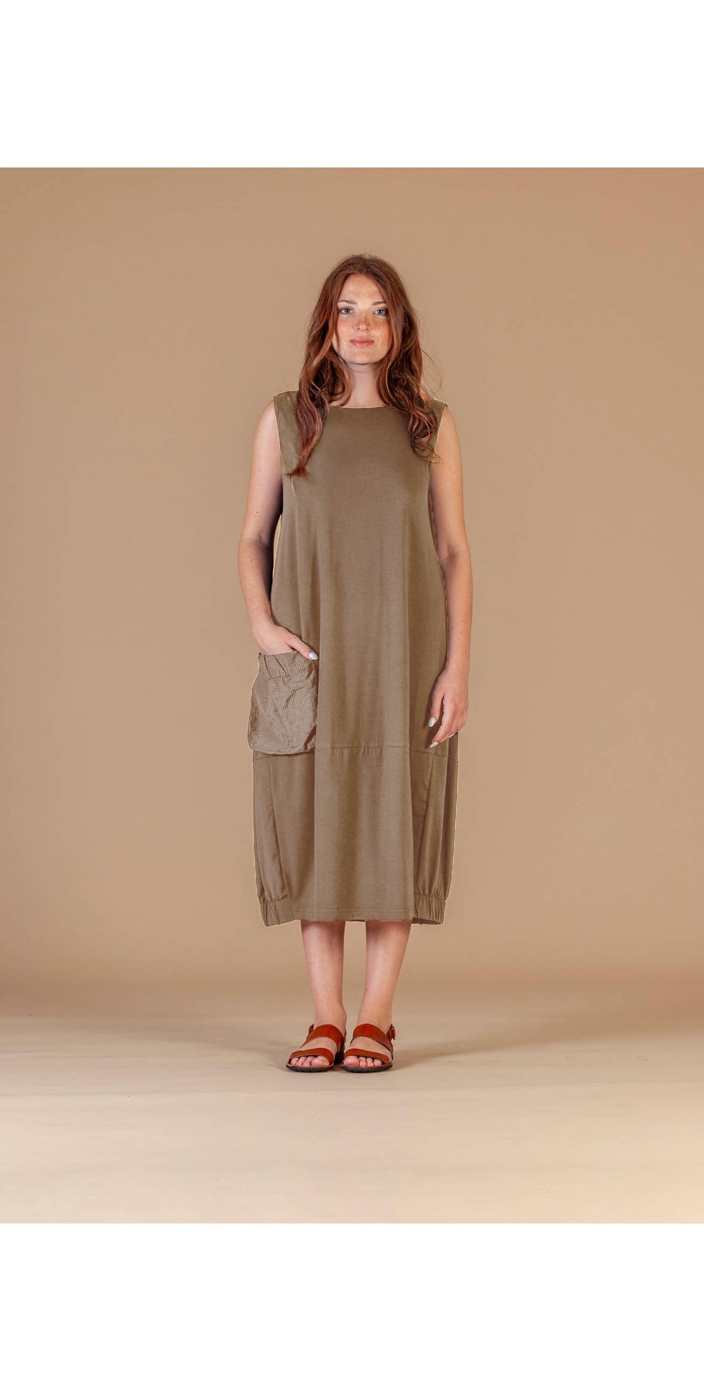 The Venerdi Contrast Crush Pocket Dress from Mama B is a stylish and effortless women’s midi dress designed for comfort and modern everyday wear. Crafted in Mama B’s signature relaxed style, this sleeveless midi dress features a round neckline and an easy pull-on design, making it perfect for effortless dressing.