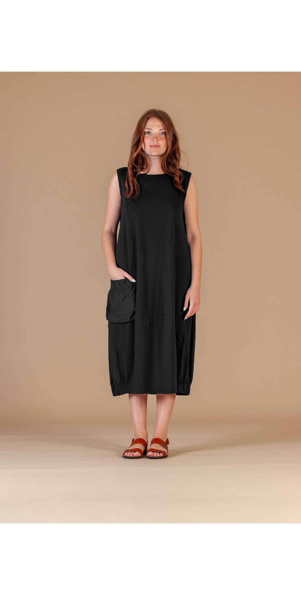 The Venerdi Contrast Crush Pocket Dress from Mama B is a stylish and effortless women’s midi dress designed for comfort and modern everyday wear. Crafted in Mama B’s signature relaxed style, this sleeveless midi dress features a round neckline and an easy pull-on design, making it perfect for effortless dressing.