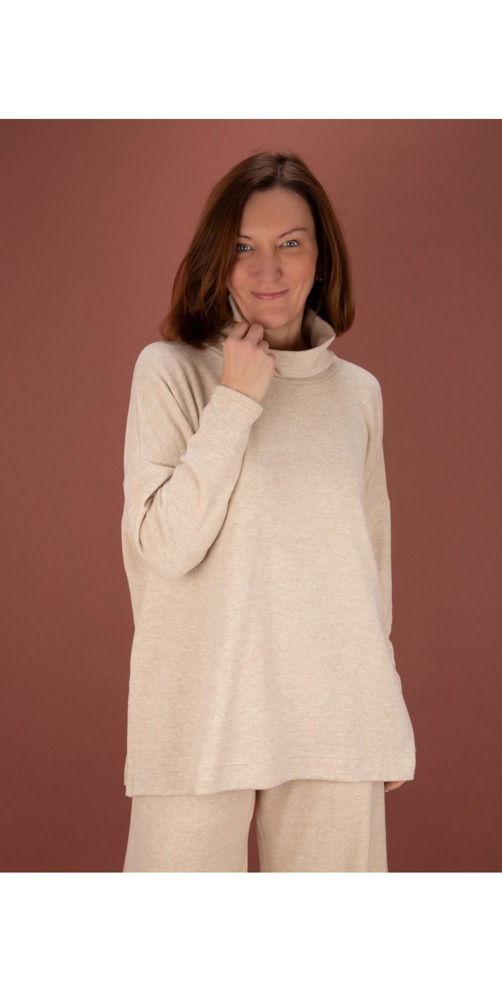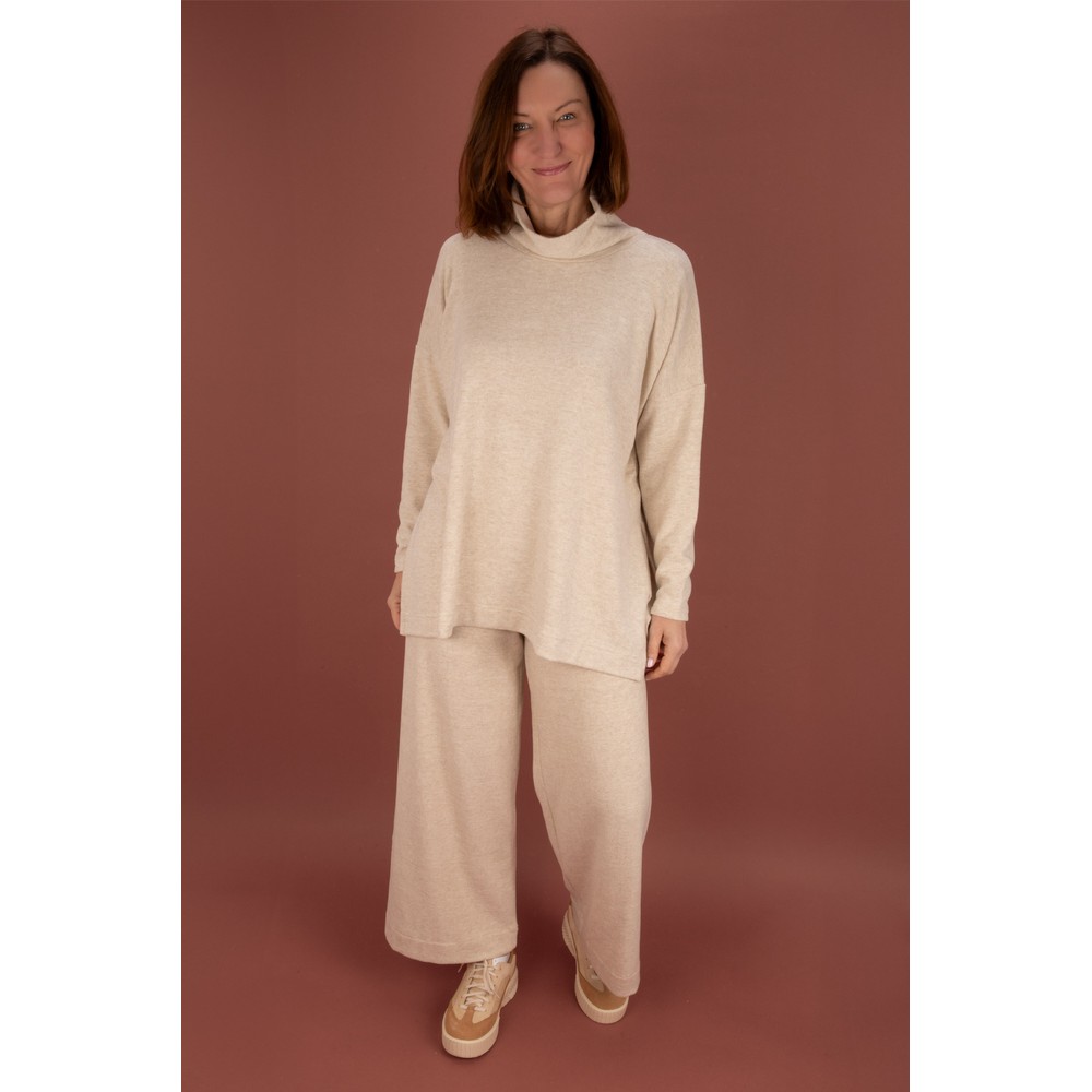 Introducing the Zita U Fleece Side Split Jumper from Mama B. featuring a relaxed style pullover with dropped shoulders, a slouchy high neckline, and side splits to create a floaty silhouette. Finished in a fleece cotton fabric for comfort and style throughout the cooler months.