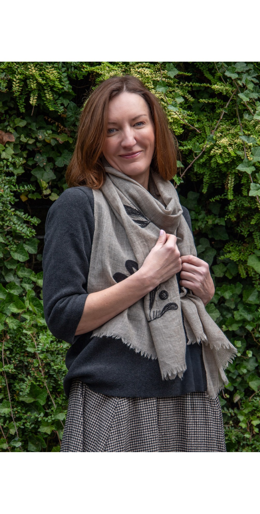 Add a touch of effortless style to your wardrobe with the Masai MaAzima Print Wool Scarf. This women’s wool scarf features a soft taupe base adorned with black abstract floral embroidery, creating a versatile accessory that complements both casual and smart outfits.