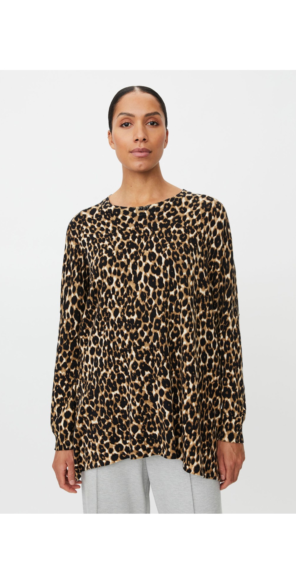 Introduce timeless flair to your knitwear collection with the Masai Feluci Jumper, where classic leopard print meets soft, comfortable cotton. Knitted in a lightweight fabric that drapes beautifully over the body, this relaxed-fit jumper features long, narrow sleeves that contrast gently with its loose silhouette for a feminine, modern look. Pair it with light-coloured trousers, denim and a patterned scarf for effortless, everyday style that feels as good as it looks