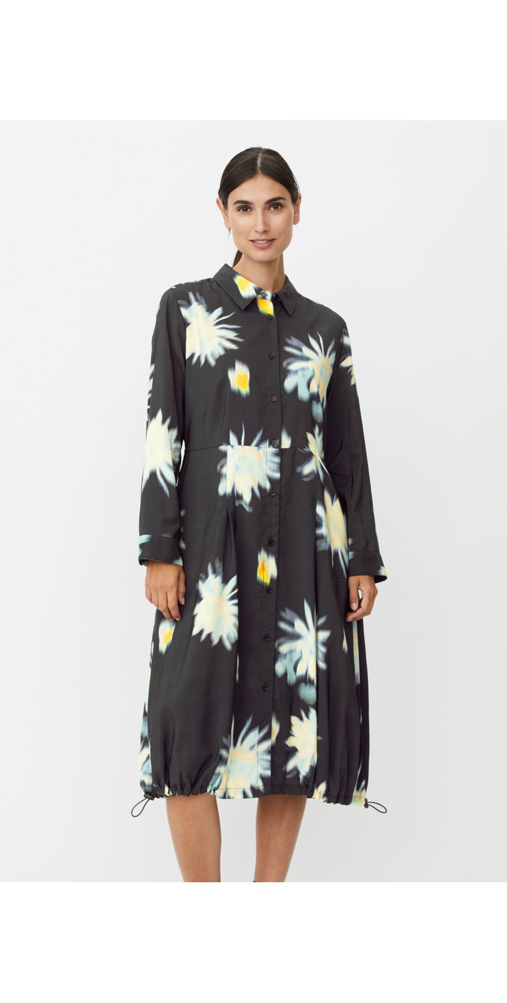 Float into effortless sophistication with the Norivelle Dress from Masai — a soft, silky viscose shirt dress where elegance meets ease. The classic shirt collar and button-through front give a timeless tailored feel, while the elasticated waist gently cinches to highlight your shape. The hemline features an adjustable elastic, creating a subtle balloon effect for a graceful, voluminous drape. Finished with an artistic print and thoughtfully designed cut, this dress is perfect for occasions when you want to look poised yet effortless — pair it with ankle boots for daytime chic or heels and statement jewellery for evening polish.