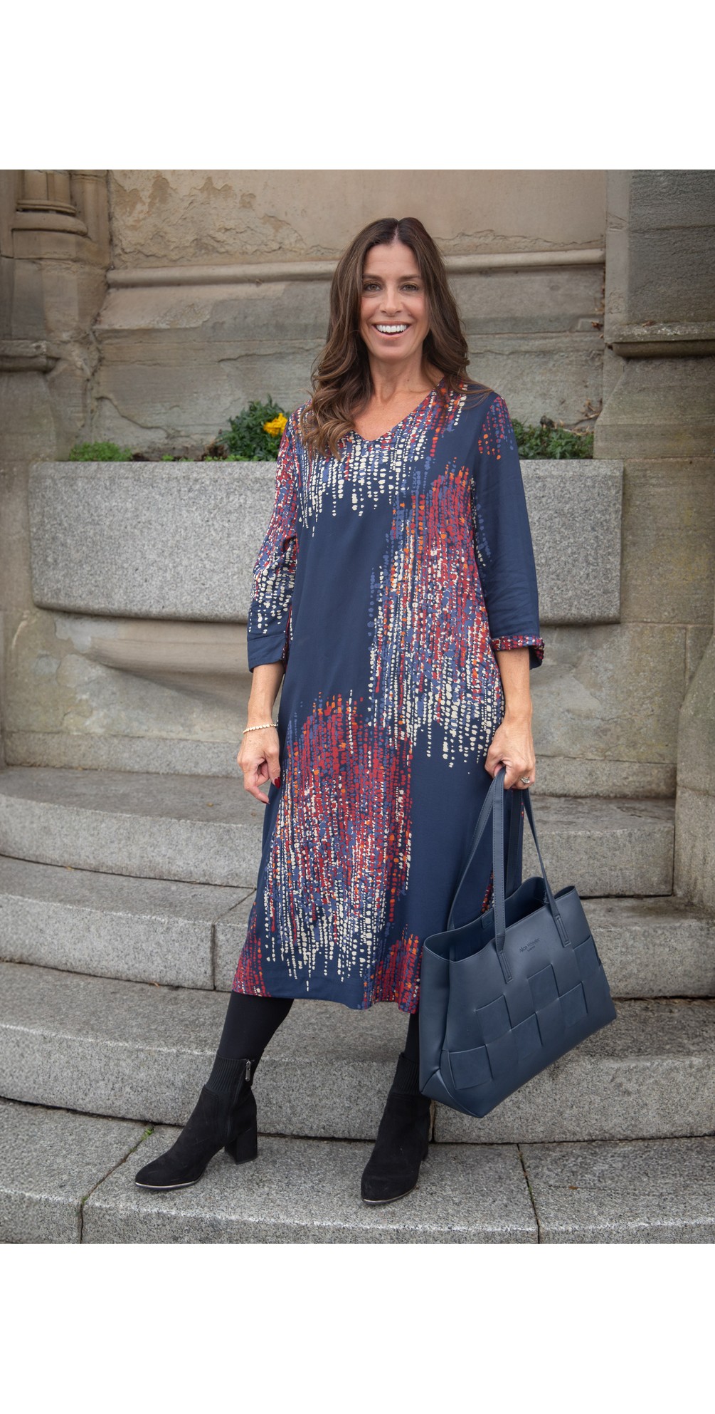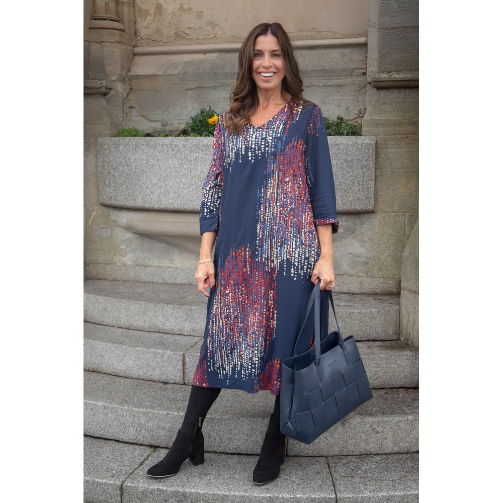 Introducing the MaNusala Print Dress from Masai iin Red dahlia. Featuring a V-neckline, Mid length sleeves and a flowy silhouette adding shape whilst yoou move. This dress is both stylish and comfortable and can be layered easily with a jacket for when it gets colder. Pair it with trainers in the daay or boots in the evening, making it versatile throughout the seasons.