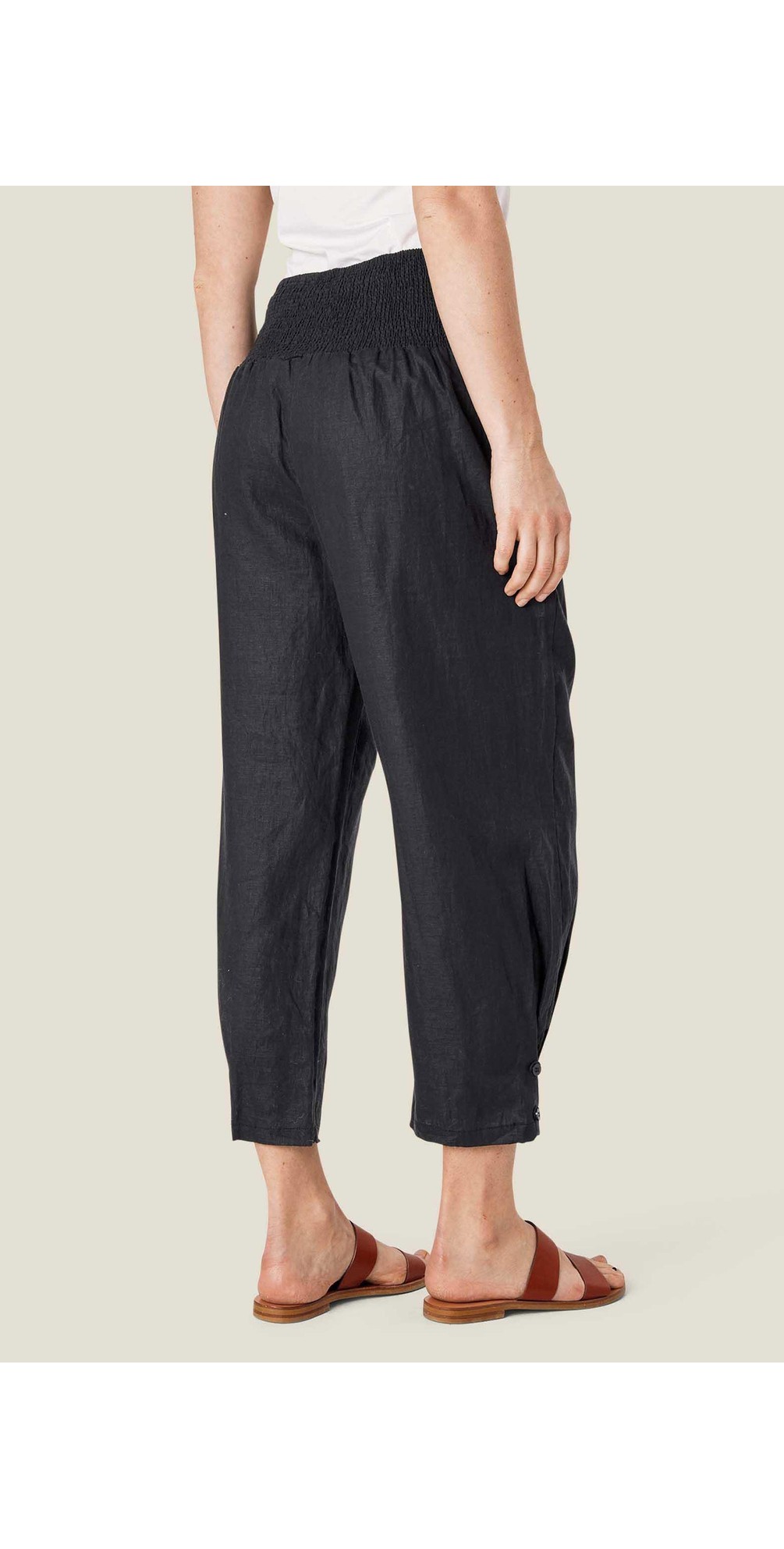Both timeless and comfortable, the MaPenna Linen Tapered Trouser by Masai is a piece you will reach for year after year. Featuring a cropped tapered leg with a button detail at the ankle, side pockets, and a wide waistband with smock detailing at the back, these trousers have just the right amount of detail while still maintaining that classic look.
