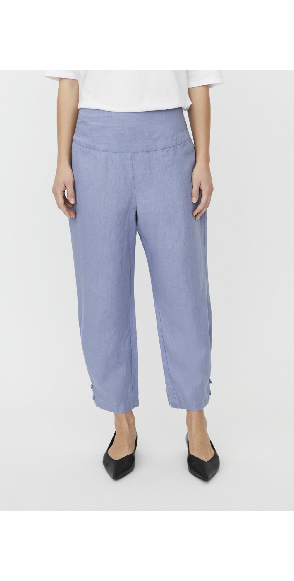 Both timeless and comfortable, the MaPenna Linen Tapered Trouser by Masai is a piece you will reach for year after year. Featuring a cropped tapered leg with a button detail at the ankle, side pockets, and a wide waistband with smock detailing at the back, these trousers have just the right amount of detail while still maintaining that classic look.