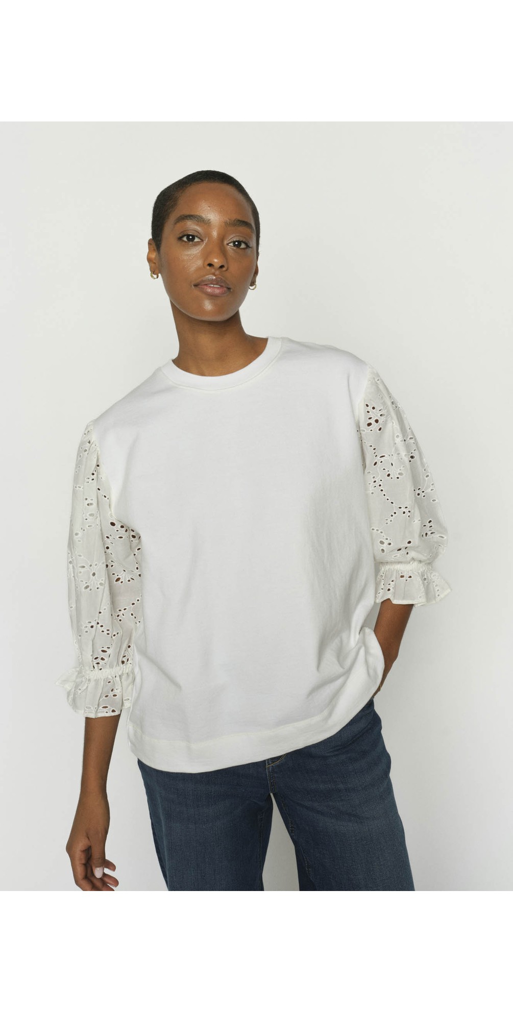 Crafted from a soft, comfortable fabric, this sweatshirt features a classic round neckline and an easy pull-on fit for effortless wear. The standout detail lies in the embroidery anglaise puff sleeves, adding texture and a subtle statement while maintaining a refined look. Finished with 3/4 length sleeves and small side splits, it offers both comfort and a flattering, relaxed silhouette.