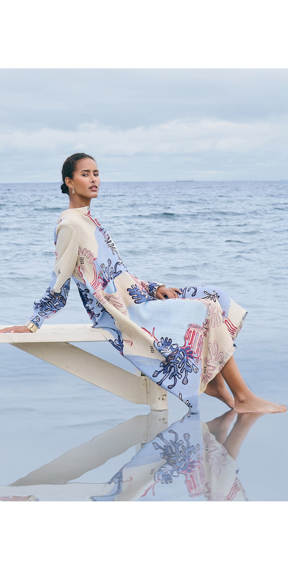 NOEN is a contemporary-fitting brand offering a relaxed yet stylish look. We recommend going down a size, particularly with many of their dresses and tunics. Please see individual product information for more detail and measurements for each garment