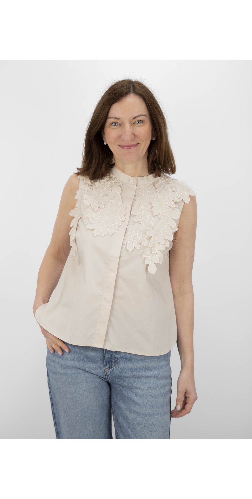 Crafted from breathable fabric, the top drapes gently over the body for a relaxed, flattering fit. The round neckline and button-up front create a simple, refined finish, while the intricate leaf appliqué design adds subtle texture and a unique, artisanal feel. Perfect for layering or wearing on its own, it pairs effortlessly with trousers, skirts, or shorts for a polished yet relaxed look.