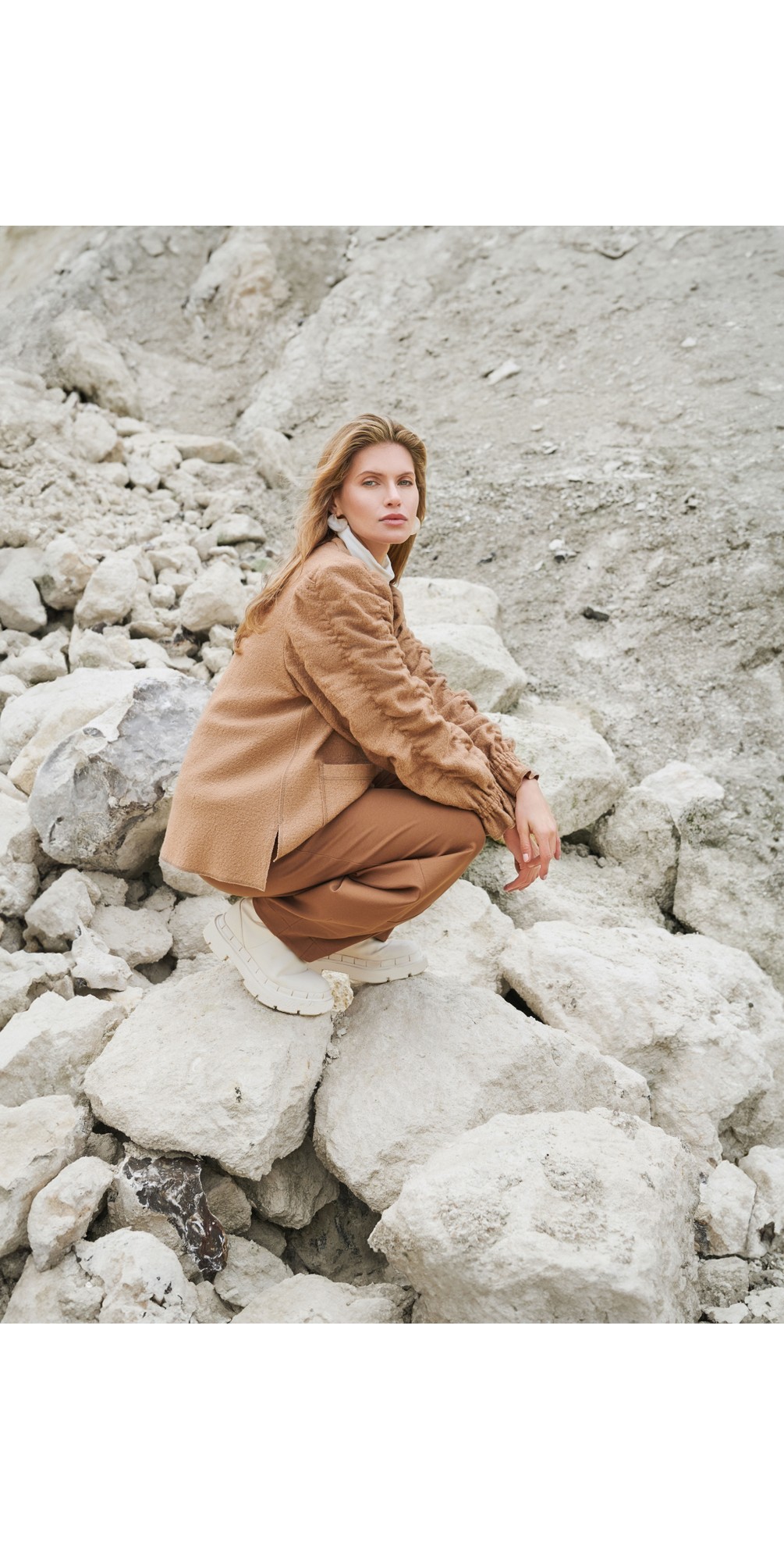 Noen's Ruched Boiled Wool Jacket is a chic lightweight jacket with feminine ruched sleeves. Crafted in a boiled wool blend, the jacket has a lovely texture which will look great layered over knitwear. Other details to note are the side slits at the hem, front pockets and elasticated cuffs.