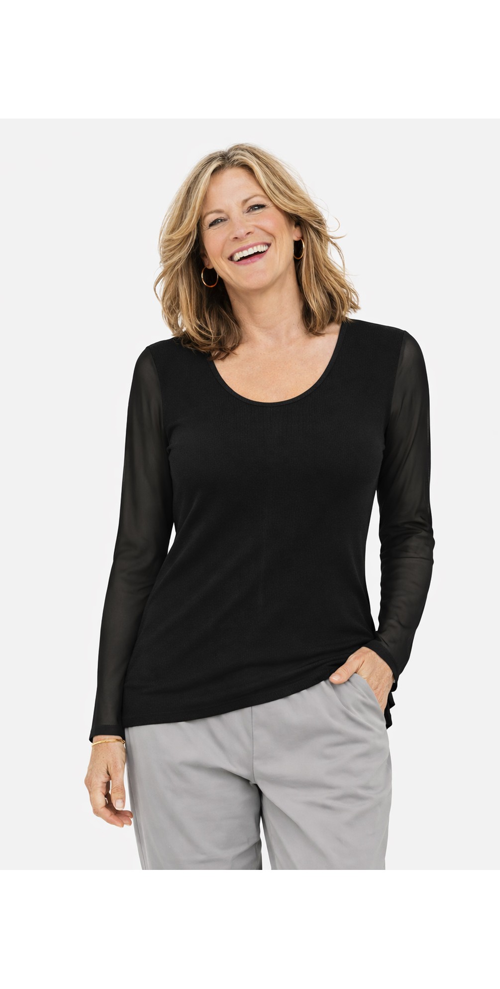 The Naya Jersey Mesh Sleeve Top is made from high-quality stretch jersey and features sheer fitted sleeves along with a round neckline. This top is designed to be incredibly flattering, gently hugging your body without feeling tight. It looks stunning when paired with jersey trousers and flats, making it an ideal choice for layering under longer tunics or sleeveless dresses. With NAYA, layering has never been so glamorous!