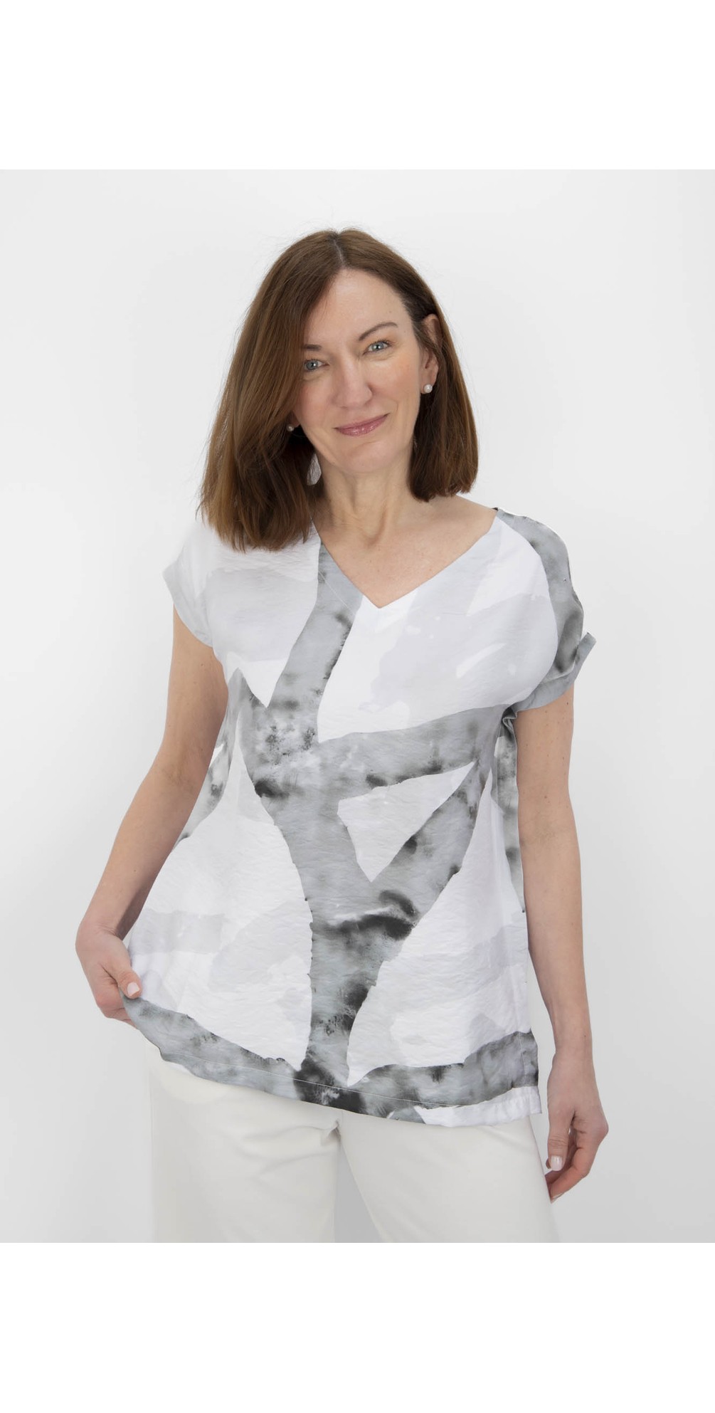 Naya Marbled Ribbon Print Top – Contemporary Asymmetric V-Neck Top