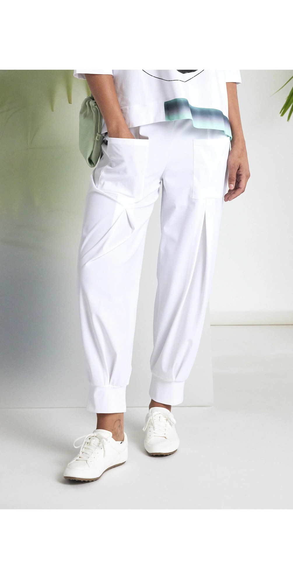 Refresh your wardrobe with the Naya Pleat Cuff Trouser, a contemporary and comfortable essential designed for effortless everyday style. These trousers feature a flattering front pleat detail that adds tailored structure, while the cuff-hem finish brings a modern twist to classic tailoring. Crafted from a soft, stretch-rich fabric with an elasticated waistband, they offer easy pull-on wearability and all-day comfort. Practical front pockets make them versatile for daily outfits, and their refined silhouette transitions seamlessly from casual looks to polished ensembles.