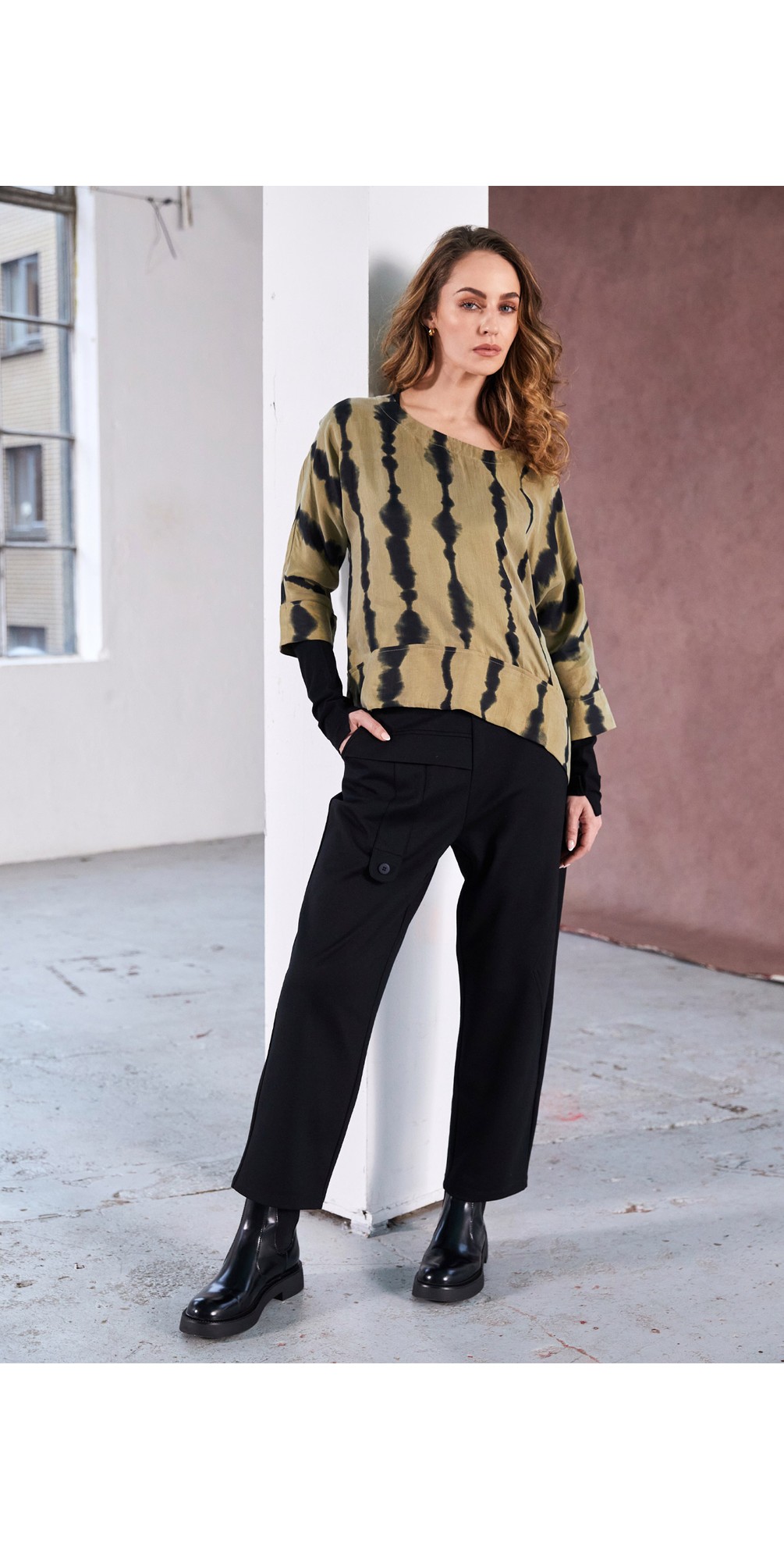 A classic with a contemporary twist, the NAYA Tapered Leg Trousers in Black are designed to offer both comfort and edge. Featuring a fully elasticated waist, front slit pockets, and a back flap pocket, they’re as practical as they are stylish. A soft button and tab detail adds subtle interest across the front, while an angled stitched seam on one leg brings an unexpected, fashion-forward touch.