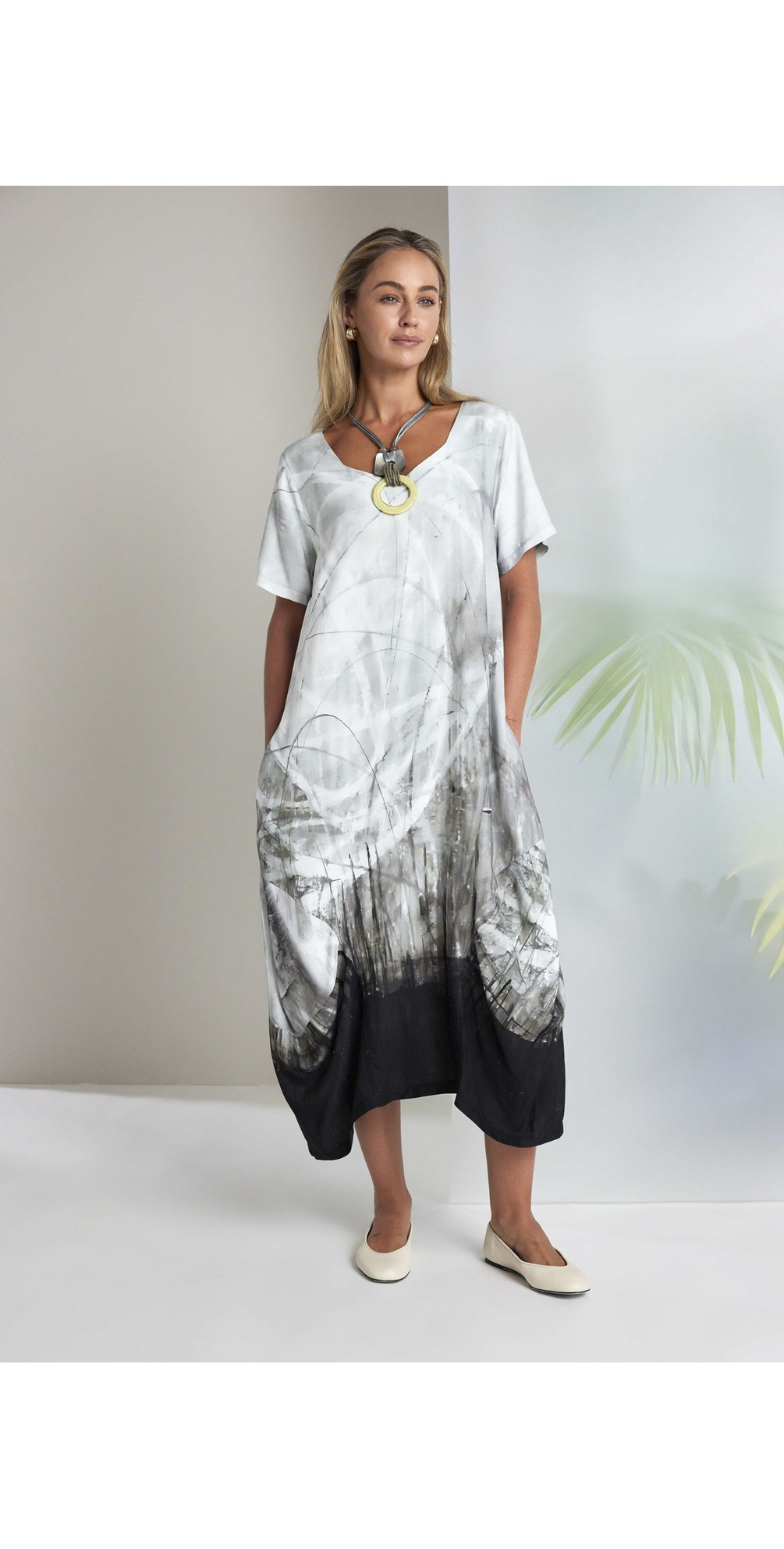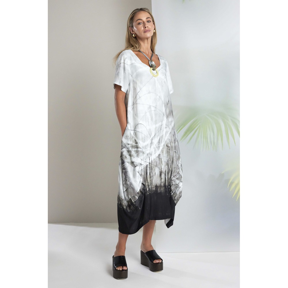 Elevate your everyday wardrobe with the Naya Taupe Border Print Dress. A modern statement piece crafted in a soft taupe tone, this stylish dress features a faded graduated print that gently blends into a striking black border hem, creating a flattering and eye-catching finish. Designed with a feminine V-neckline and short sleeves, this dress offers an easy, relaxed feel while maintaining a polished look. The dipped hemline, falling longer at the back, adds movement and modern shape, while the signature bubble silhouette creates a soft, contemporary structure that Naya is known for.