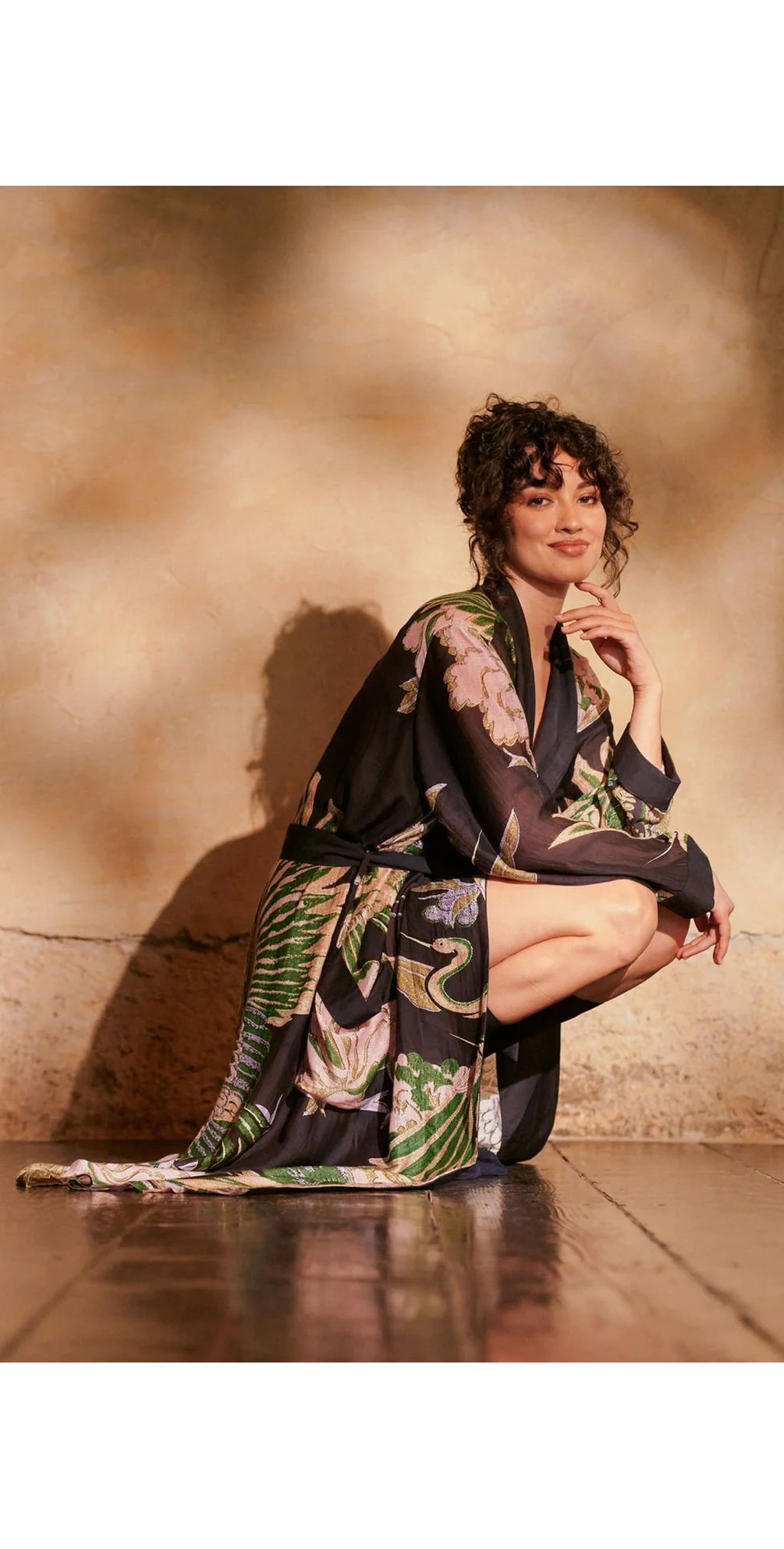 Featuring a flattering fold-over collar, front patch pockets, and a self-tie belt for a custom fit, this printed gown is perfect to wear as a luxurious house coat, stylish loungewear, or a chic layering piece. With its timeless design and sustainable credentials, it also makes a thoughtful gift idea for someone special.