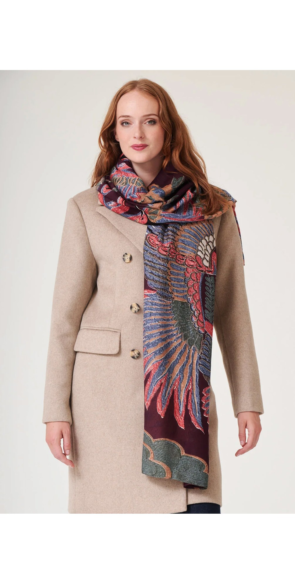 Add a touch of elegance to any outfit with the One Hundred Stars Luxury Printed Scarf, a timeless addition to the OHS Collection. Crafted from a soft, sustainable blend of 50% Modal and 50% Cupro, this silk-effect scarf drapes beautifully and feels lightweight yet luxurious against the skin. Symbolising good fortune and longevity, the Crane print has become a classic. Large, graceful cranes in coral, blue, and jade green soar across a rich plum base, creating a striking statement piece. Perfect for Autumn, this colourway adds warmth and sophistication to your seasonal wardrobe.