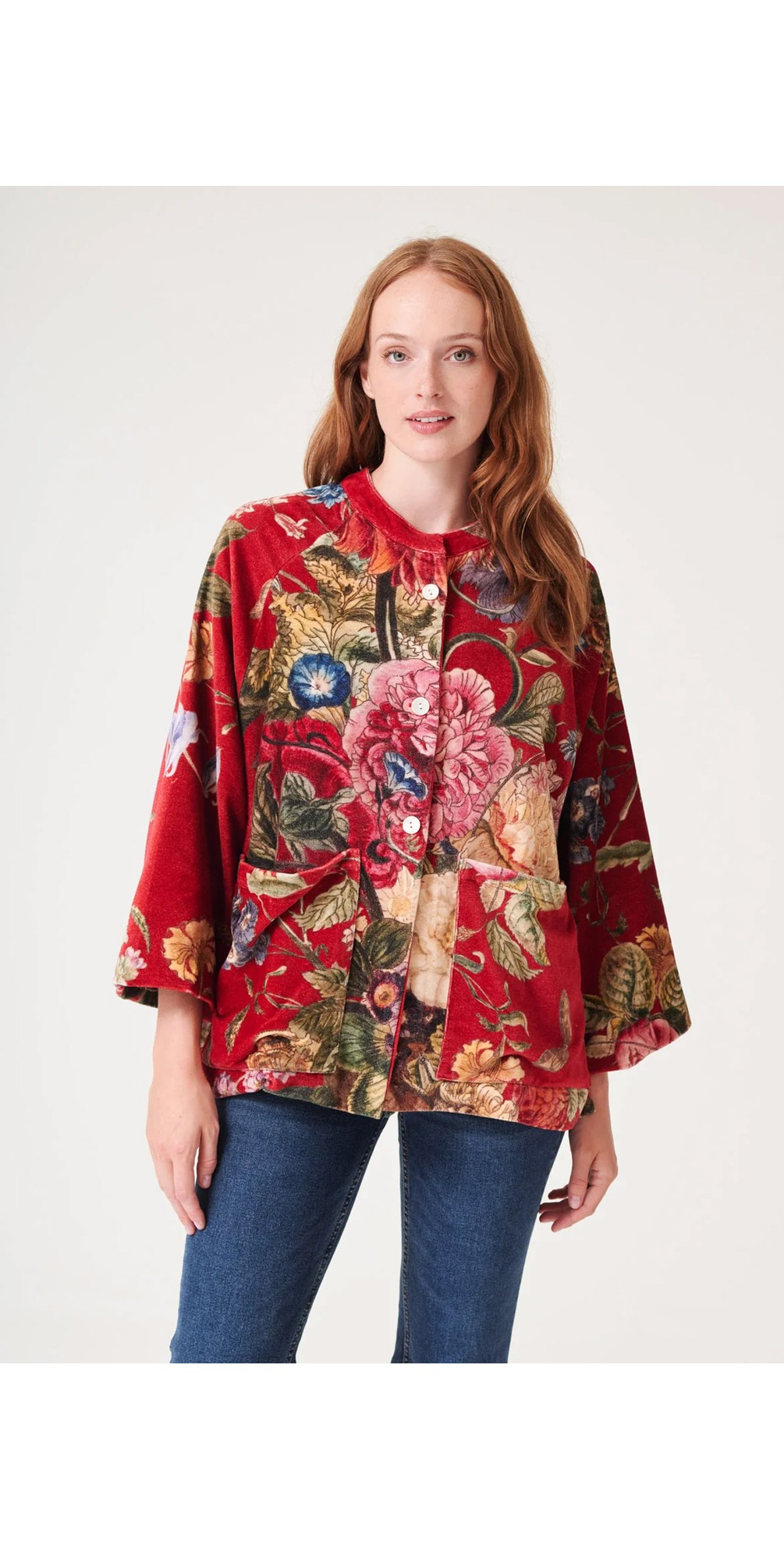 Inspired by the Dutch Old Masters, the Primula Berry Velvet Jacket showcases a stunning floral print: a blooming bouquet of primroses, auriculas, and polyanthus flowers in a bold, vibrant colour palette. The intricate detailing and painterly design make this printed velvet jacket a standout piece in any wardrobe, adding both sophistication and artistry to everyday outfits. This luxury printed velvet jacket is a stylish and sustainable addition to your wardrobe — ideal for layering and adding a touch of artistic elegance to cooler-season outfits.