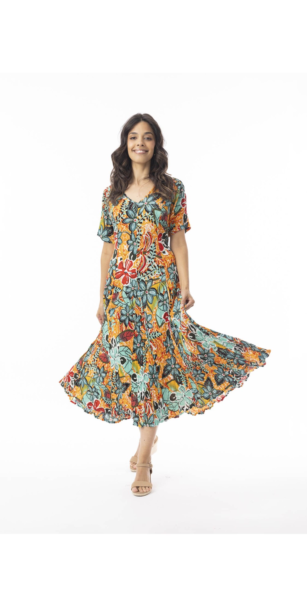 Flaunt effortless summer style with the Orientique Guaratiba Print Godet Dress, designed for comfort, movement, and standout appeal. Crafted from lightweight rayon crepe made from natural fibres, this breathable midi dress is perfect for warm-weather days and holiday dressing. Featuring a flattering V-neckline and short sleeves, this elegant summer dress is designed to keep you cool while enhancing your silhouette. The godet panels in the skirt create beautiful movement and a soft, flowing drape, adding a touch of femininity to every step.