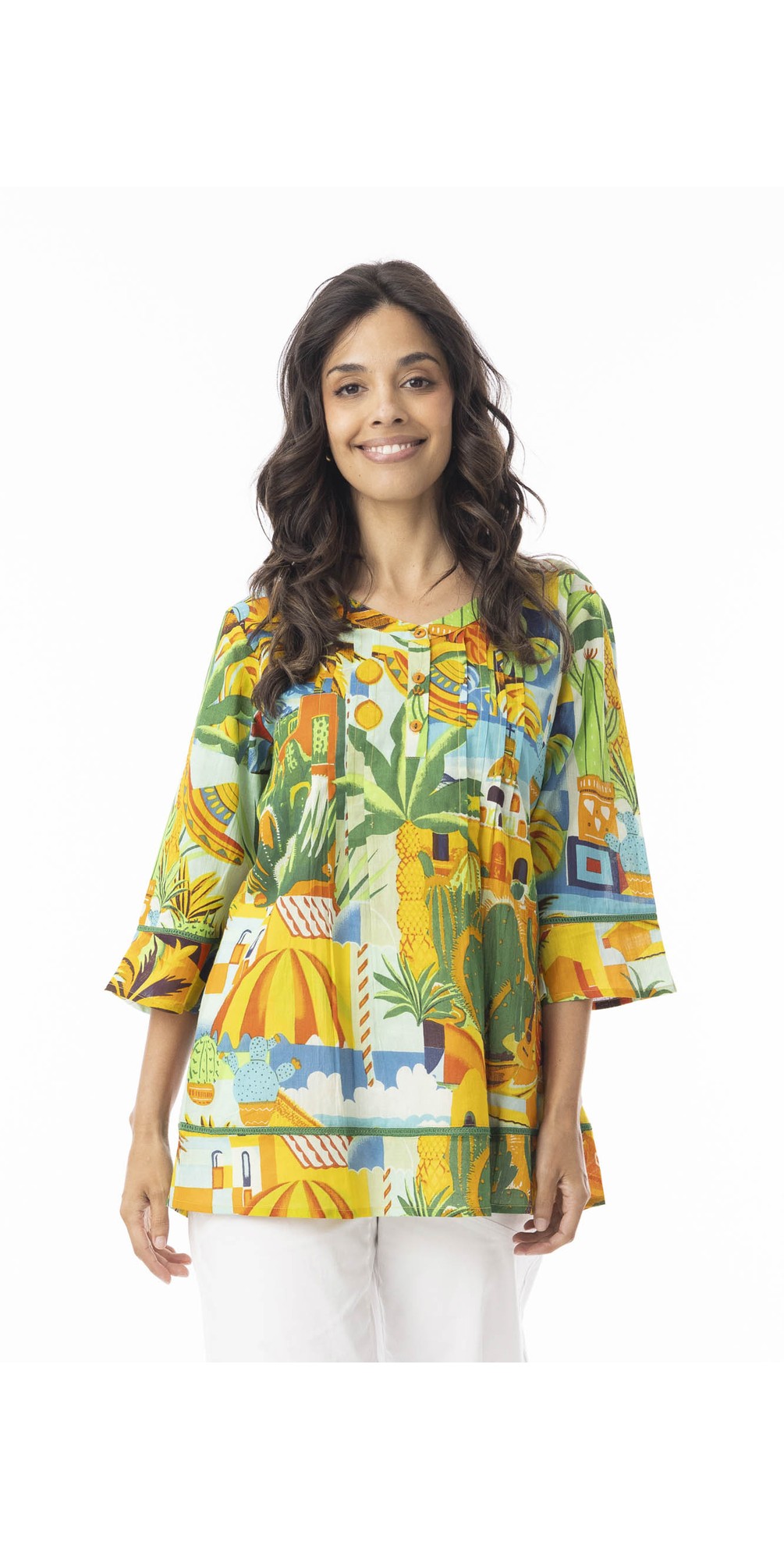 Crafted from lightweight, breathable fabric, the Guatemala Print Pleated Top offers comfortable all-day wear with a flattering silhouette. The graceful pleated detailing adds subtle texture and movement, while the relaxed cut creates an easy, polished finish. Pair it with linen trousers, denim shorts, or skirts for versatile styling that transitions from casual daytime outfits to stylish evening looks.