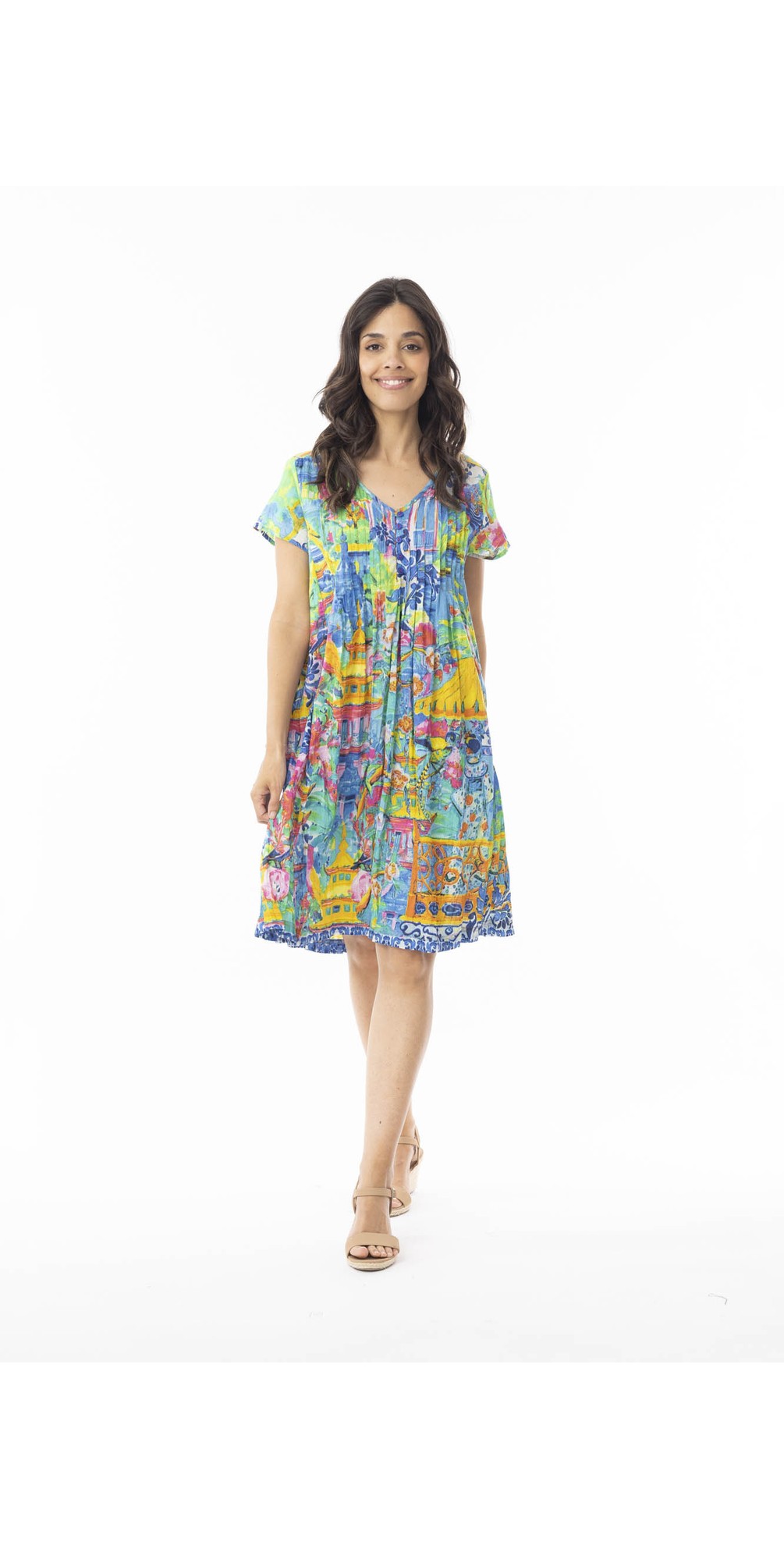 Made from lightweight, breathable organic cotton, the dress feels soft and airy while offering a loose, flattering fit. It features a feminine V-neckline with subtle button detailing for added interest, while soft pleating through the bodice creates gentle shaping. Cap sleeves provide light coverage and an easy, comfortable feel, keeping the look cool and relaxed. Designed with a fluid drape and typically falling to a knee-length finish, this printed dress pairs effortlessly with sandals or trainers for an easy daytime or travel-ready outfit.
