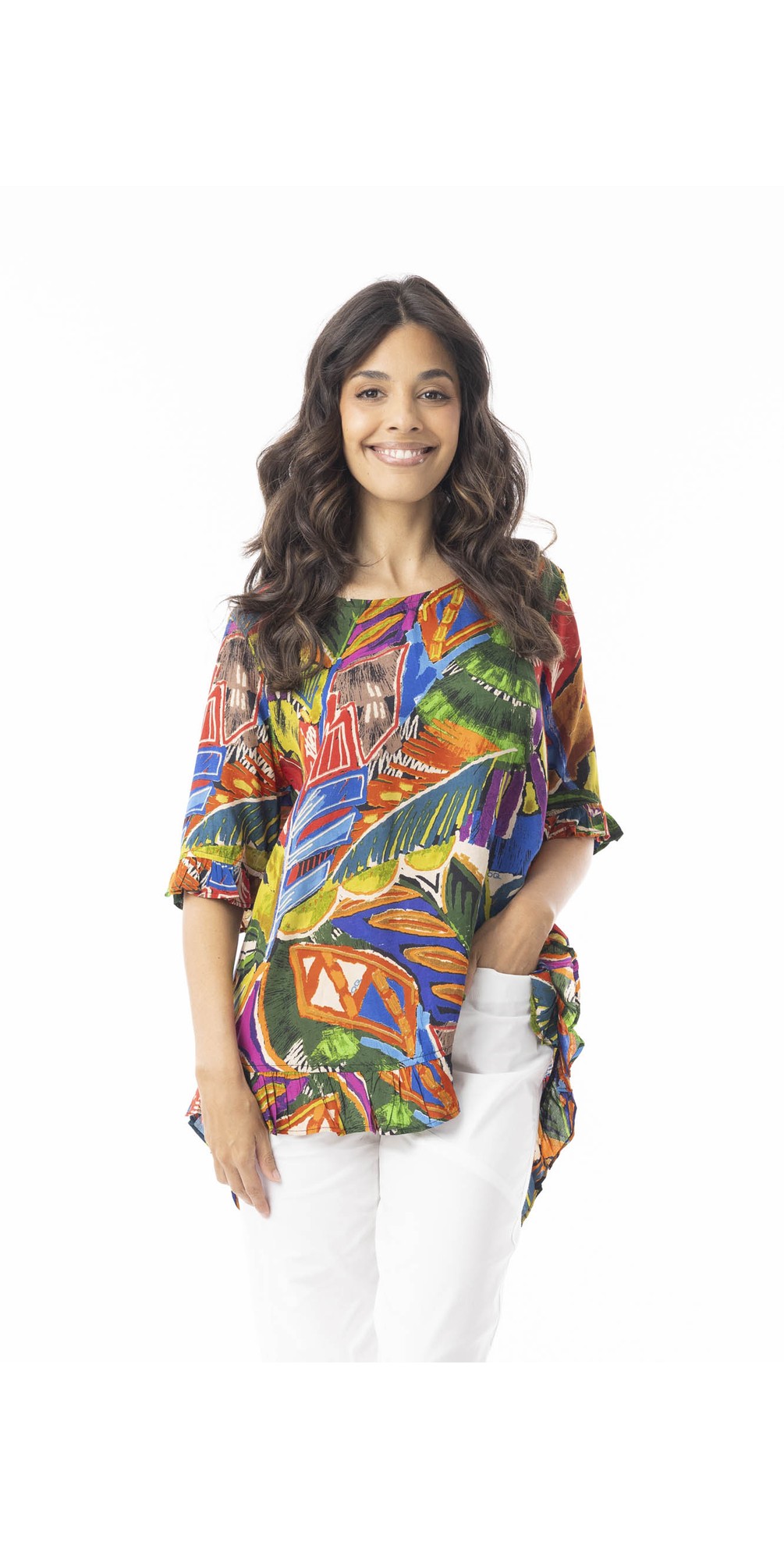 The Orientique Torgua Print Frill Top is a vibrant women’s blouse designed to bring bold pattern and feminine detail to your seasonal wardrobe. Featuring an eye-catching Torgua-inspired print, this top blends effortless style with graceful movement — perfect for relaxed daytime outfits and warm-weather styling.
