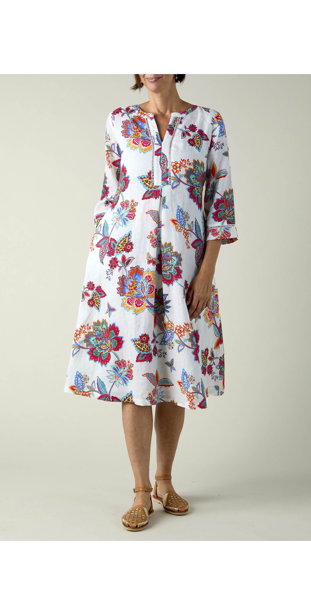 Crafted from breathable linen, this dress offers a lightweight and comfortable feel, perfect for warmer days. The flared A-line shape creates a soft, flowing silhouette that moves gracefully with the body, while the botanical print adds a vibrant, eye-catching finish. Designed with a round neckline and easy pull-on style, it ensures both comfort and versatility for everyday wear.