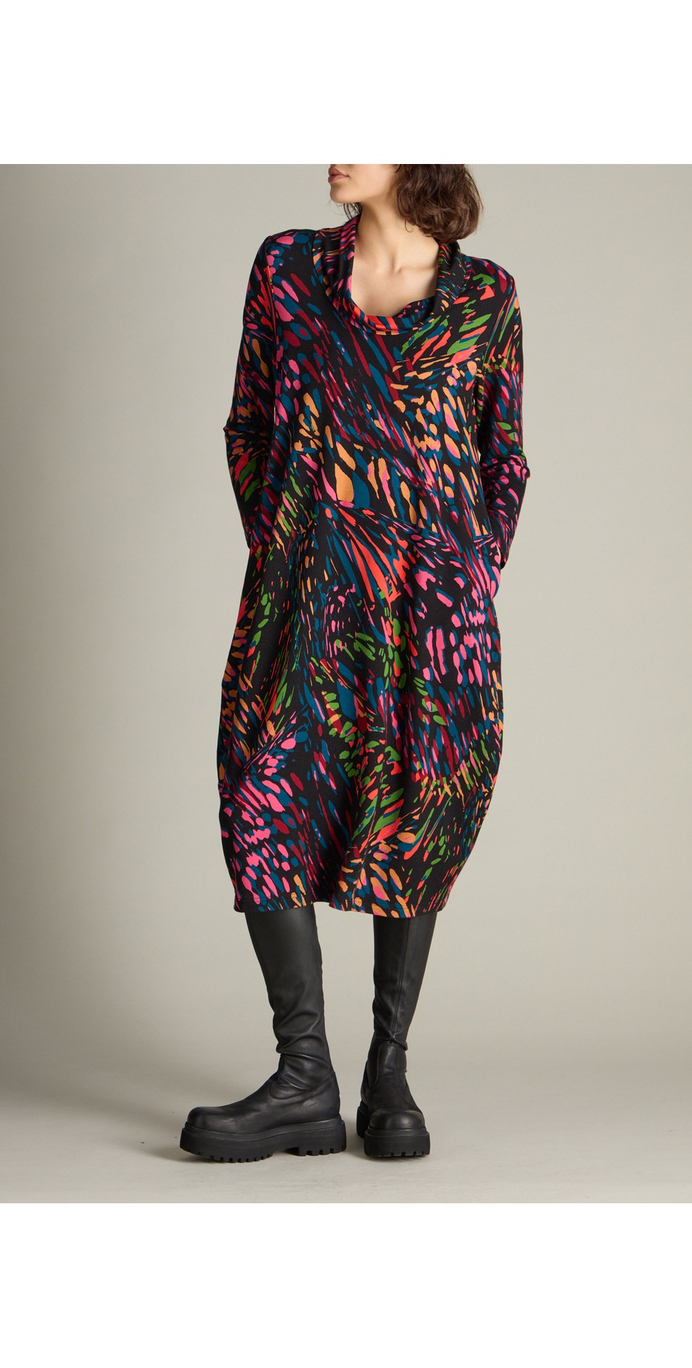 Turn heads in the Sahara Bright Scattered Wings Dress, a standout silhouette in a fiery abstract print that dances across a dark base. This dress is cut from Lenzing™ EcoVero™ jersey, combining sustainability with softness and a touch of stretch for comfort. The bubble silhouette is accentuated by a cowl neckline, full-length sleeves, and discreet side pockets — bridging drama with practical elegance. Whether styled with boots for winter warmth or heels for an evening occasion, the fluid drape and sculptural shape create an effortlessly flattering fit.