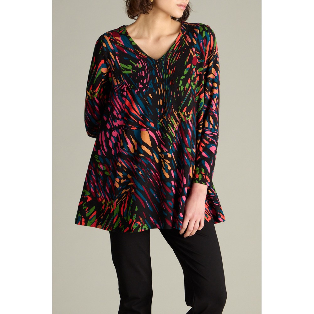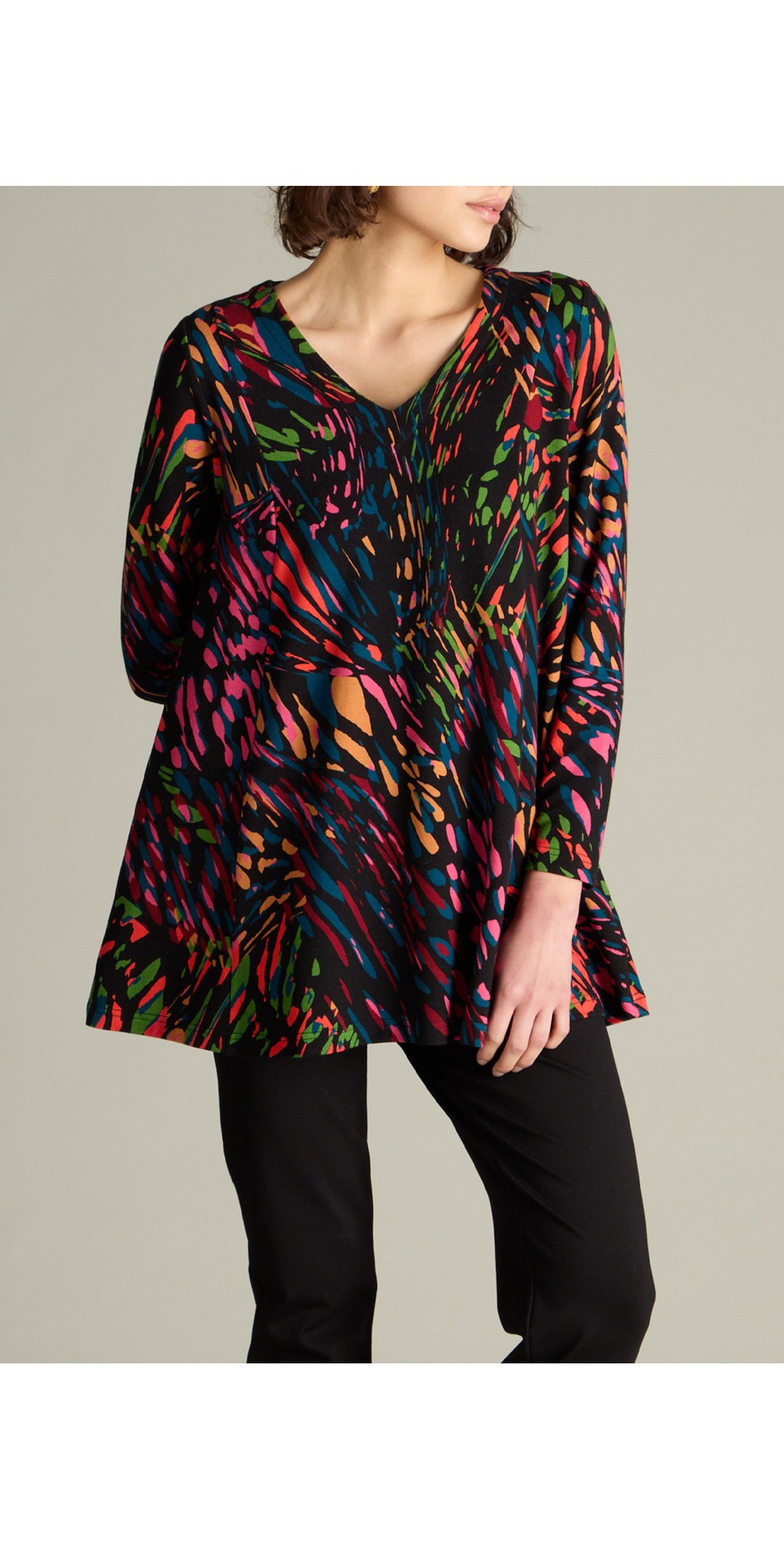 Make everyday dressing extraordinary with the Sahara Skyfire Jersey Top. This long-line jersey top showcases an expressive abstract “Skyfire” print — a vibrant blend of fiery tones layered over rich depth — for a piece that draws the eye. Crafted from soft jersey, it offers drape, breathability, and a smooth fit. The fit-and-flare silhouette flatters by skimming the bust and gently widening through the body, while the V-neckline and long sleeves provide elegant balance. It works beautifully over slim trousers or as a layering piece under jackets and knits. Versatile and statement-making, it adapts from day to evening with ease.