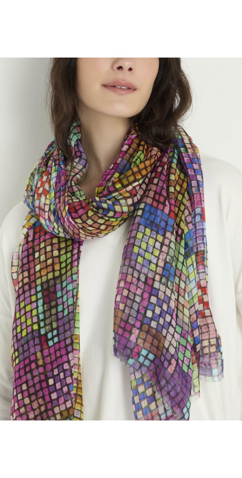 Designed to elevate even the simplest outfit, the Coloured Glass Tiles Scarf is a timeless yet expressive piece, ideal for year-round wear.