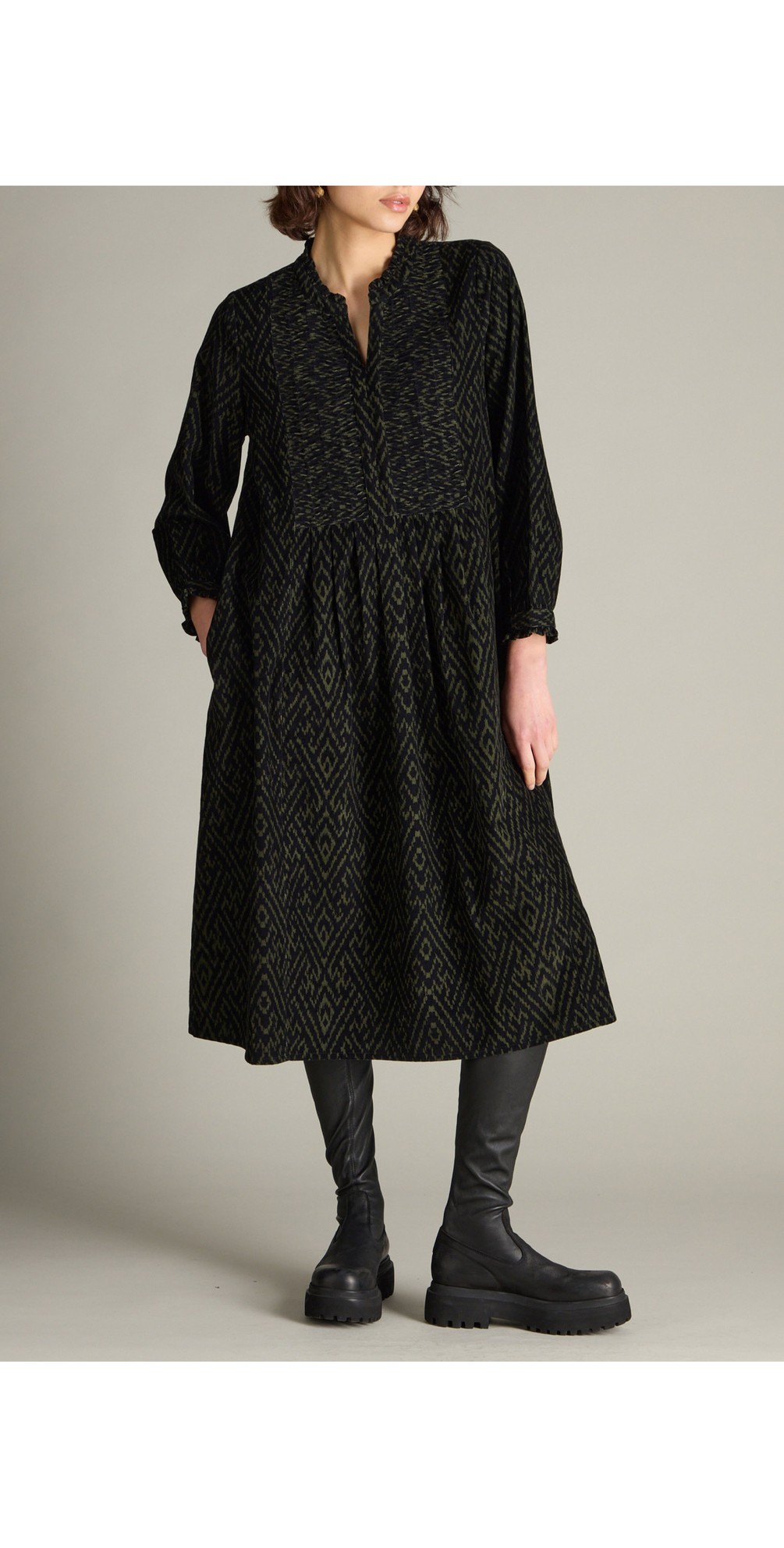 The Sahara Omate Textured Cord Dress brings texture and drama to your wardrobe in one statement-making piece. Crafted from tactile cord fabric with an intricate ornate motif in black and khaki tones, the dress exudes depth and visual richness. Its relaxed “Classic Fit” silhouette skims without clinging, creating an effortless elegance that flatters many shapes. Subtle seaming and expert tailoring add structure and movement, while the mid-midi length ensures versatility across seasons. Style it with ankle boots and a long coat for everyday wear, or layer bold jewellery and heels for evening polish. The textured finish ensures this dress holds visual interest even when accessorised simply.