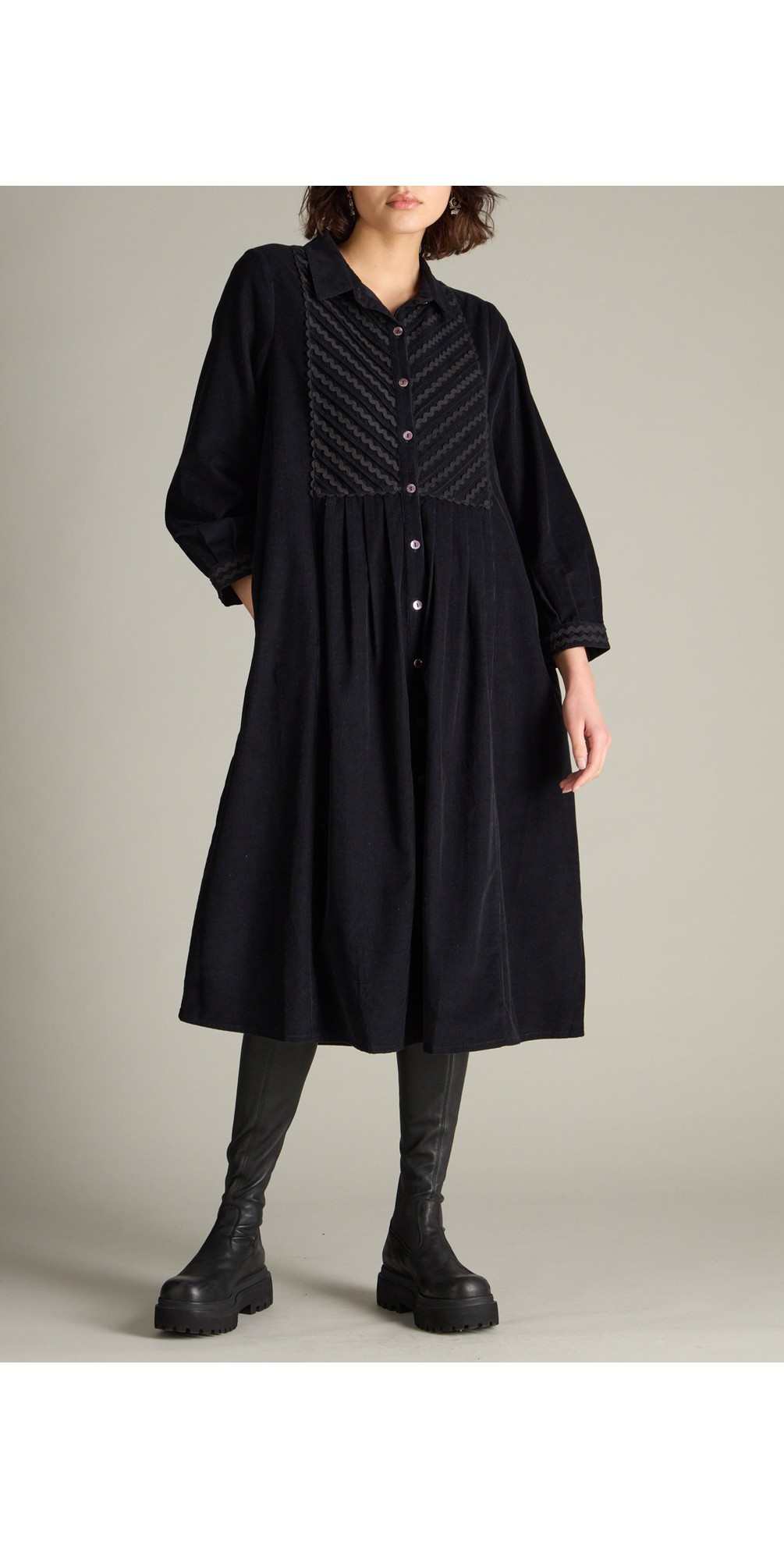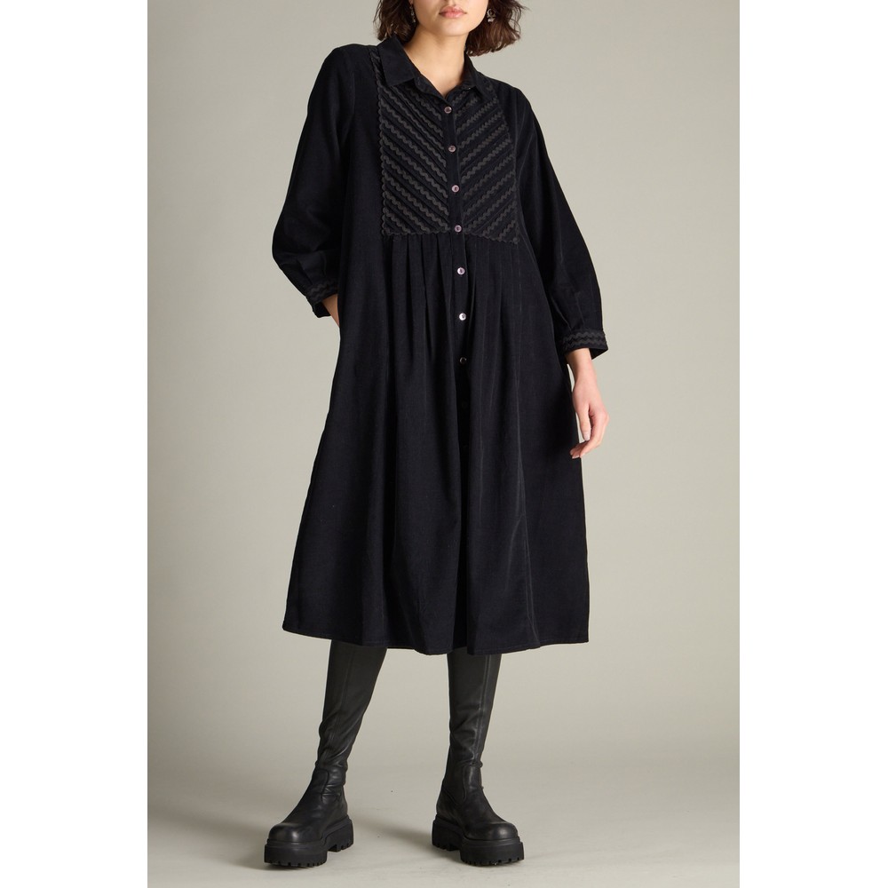 Step into textured elegance with the Sahara Pinwale Cord Ric Rac Detail Dress — a refined blend of vintage charm and modern tailoring. Crafted from soft cotton pinwale cord, this A-line dress features a standout ric rac trim framing the front bib and cuffs for sculptural visual contrast. Diagonal pleats across the bib and gentle shaping at the back and waist provide subtle structure without rigidity. The smoke-shell buttons down the front placket add a delicate, artisanal touch. With its classic fit — designed to skim effortlessly — this dress transitions gracefully between seasons. Style over tights and boots or bare-legged with flats; layer under knits or jackets for added versatility.