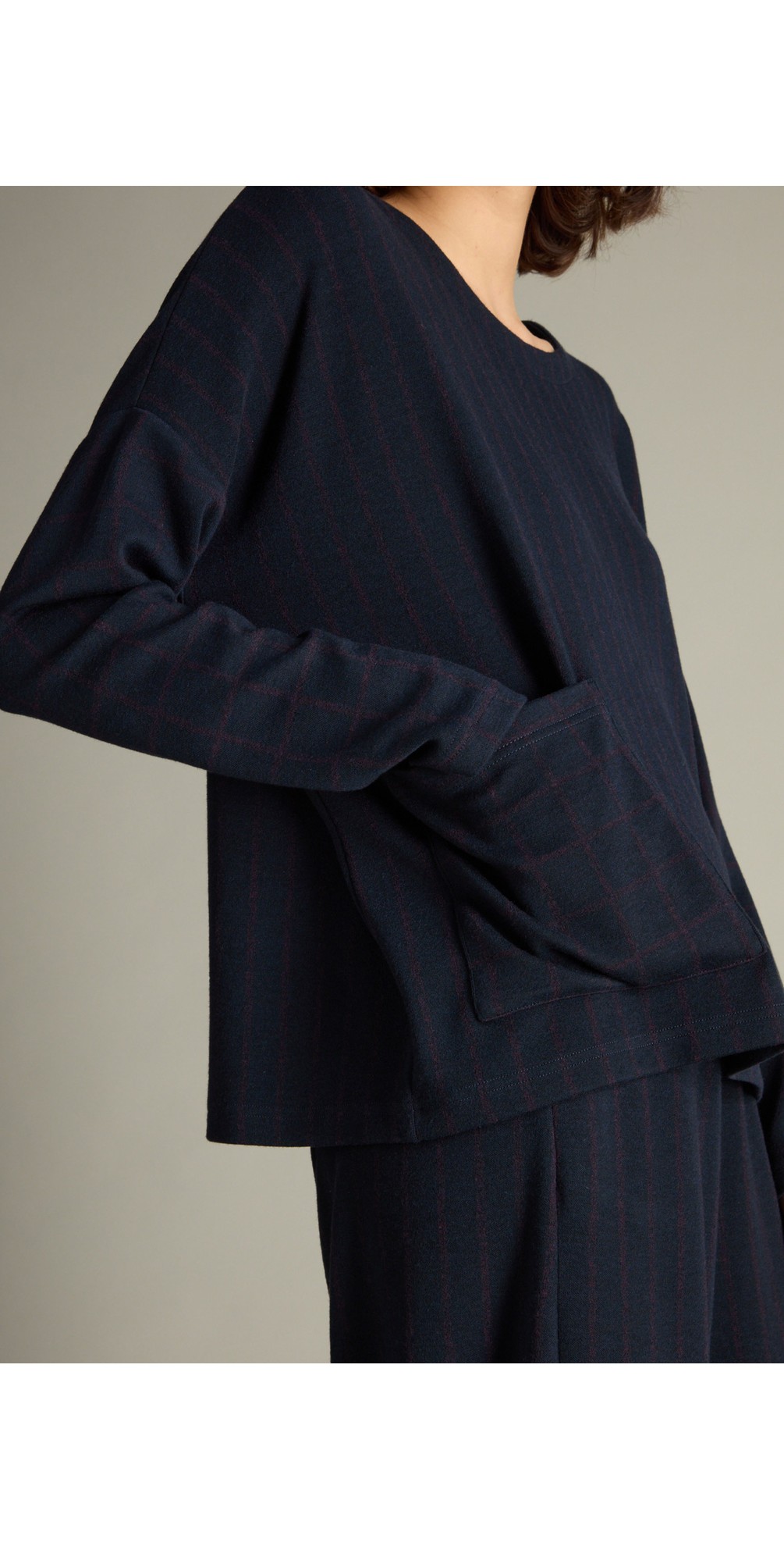 • Distinctive graphic broken check + stripe print in Night/Plum tones