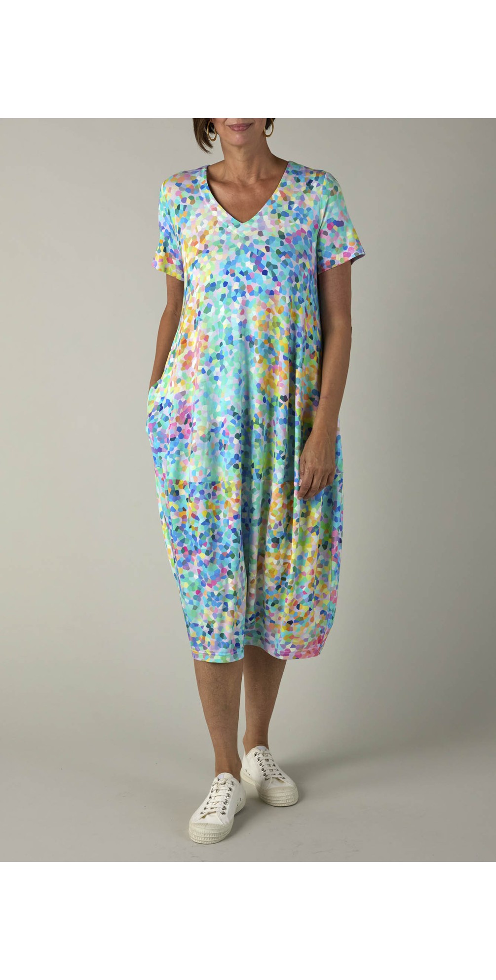 Crafted from a lightweight jersey fabric with a soft, silky hand feel, this dress drapes beautifully over the body, offering both breathability and all-day comfort. The relaxed cocoon silhouette gently tapers at the hem, creating a flattering bubble shape that moves with ease. Finished with a simple round neckline, it allows the bold confetti-inspired print to take centre stage, adding a playful yet sophisticated touch.