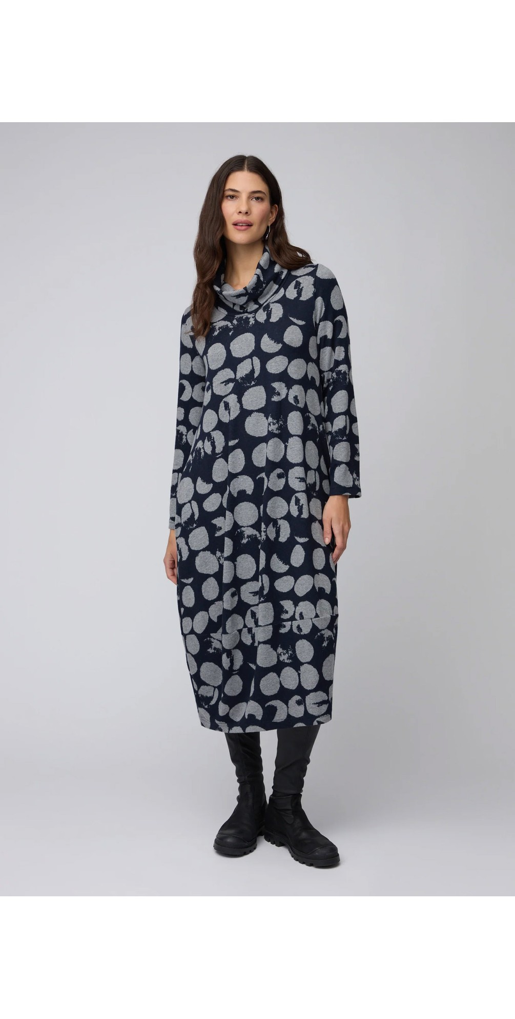Embrace effortless elegance with the Sahara Brushed Spot Jersey Bubble Dress, a midi-length piece that fuses sculptural form with soft comfort. Crafted in brushed jersey, its signature bubble silhouette is shaped through gentle curved seams, giving structure without stiffness. The cowl neckline and long sleeves add warmth and polish, while the bold, tonal spot pattern brings artistic flair and visual interest. Perfect for transitional days, it pairs beautifully with boots for daytime ease or dresses up with metallic accessories for evening wear