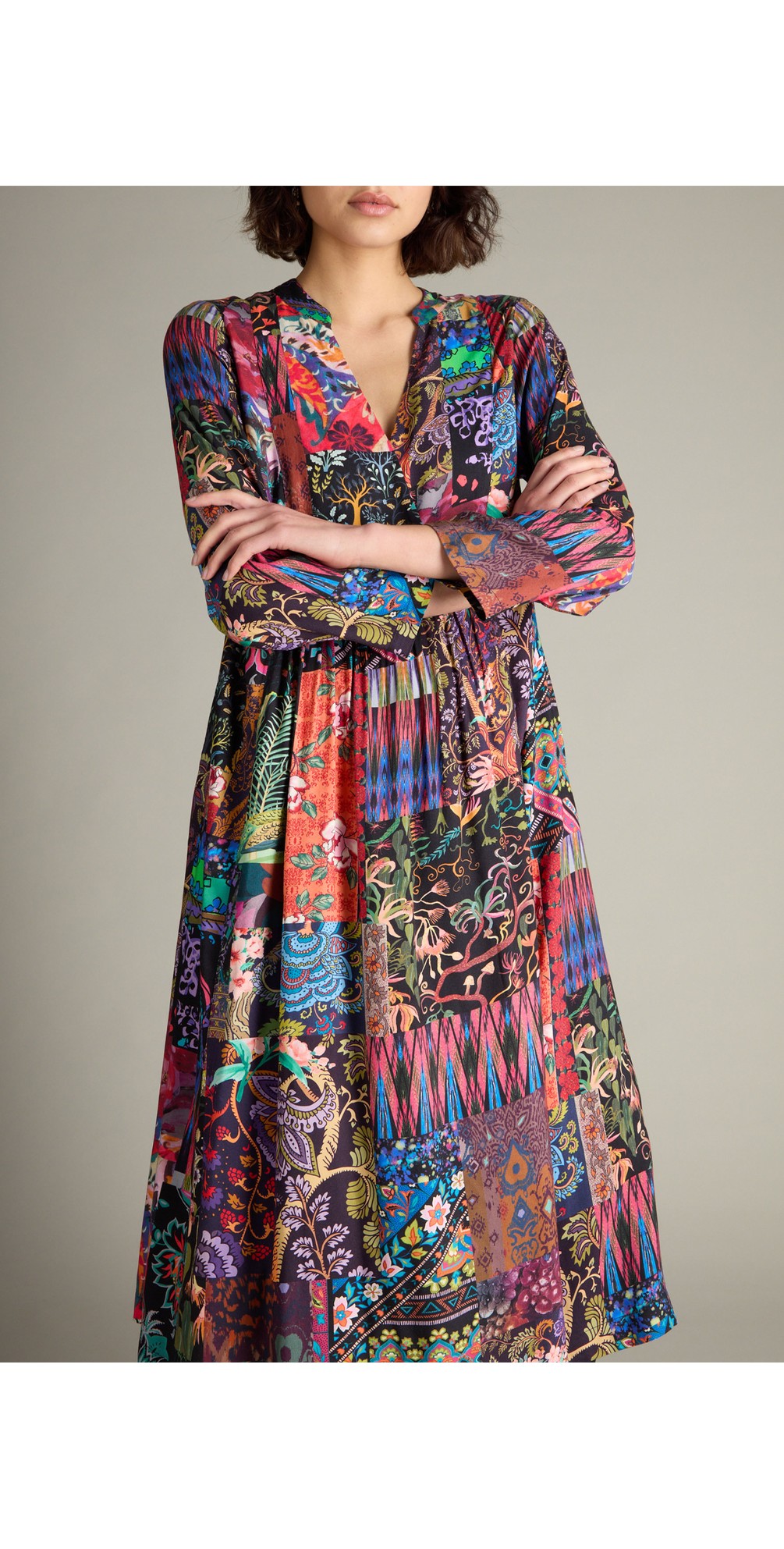 Make an impact in the Sahara Winter Patchwork Dress, where bold artistry meets wearable elegance. This midi dress features Sahara’s signature Winter Patchwork print, a vivid tapestry of jewel tones and intricate motifs that demand attention. The classic fit gracefully skims the body — relaxed yet flattering — with gentle gathers flowing from a fixed wrap bib both front and back. Bracelet-length sleeves with cuff detail, a soft stand collar, and side seam pockets blend sophistication and practicality. Whether styled for daytime or evening, this dress bridges bold design and everyday grace.