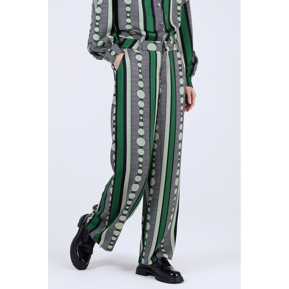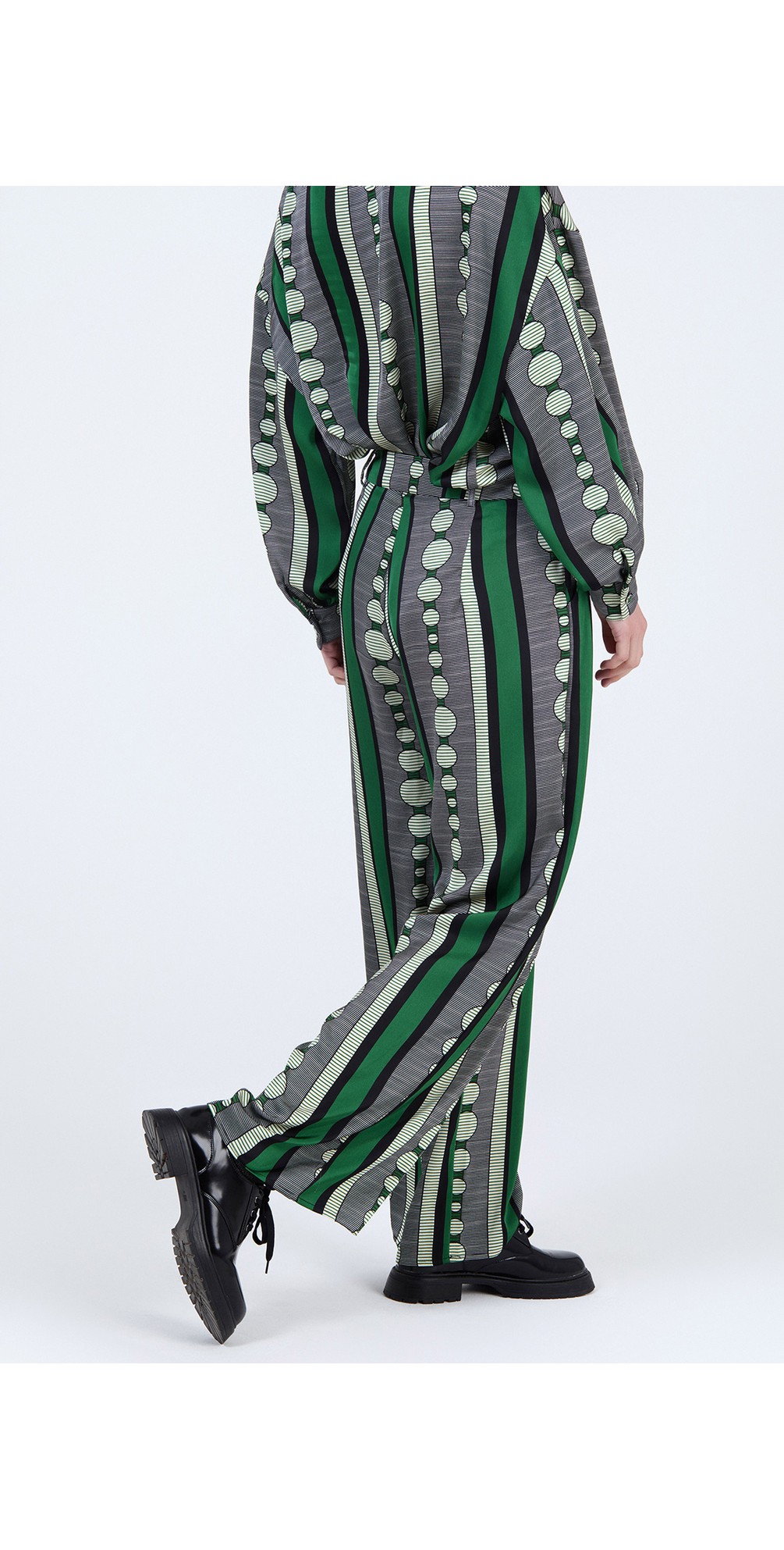 Make a statement this season with the Circle Print Trouser from Skatie. Designed with a flattering wide leg and classic belt loops, these trousers showcase a playful green and black circle print that also comes in a coordinating shirt for a bold matching set. Crafted from a lightweight fabric, they’re versatile enough to style year-round—pair with cosy knitwear and jackets in cooler weather, or keep it light and breezy for warmer days. The ankle-grazing length makes them perfect for showing off boots, while trainers bring an effortless, casual edge.