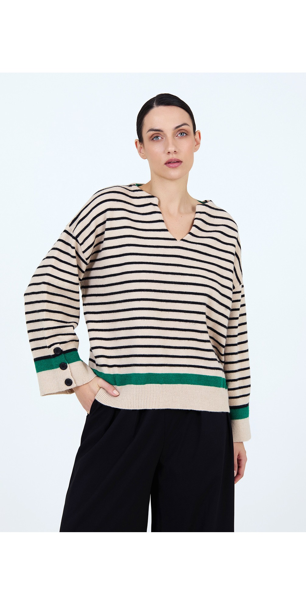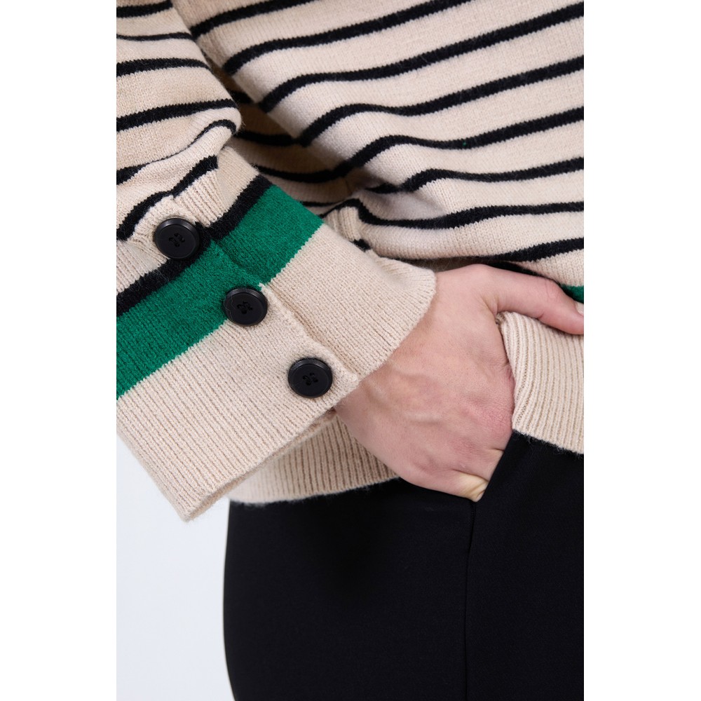 Refresh your knitwear line-up with the Contrast Stripes Sweater from Skatie. Featuring bold contrasting stripe details, a soft knit body, and ribbed trims at the hem and cuffs, this piece brings effortless style to your layering. Pair it with tailored trousers or denim for a chic off-duty look, or layer under a coat for extra warmth.
