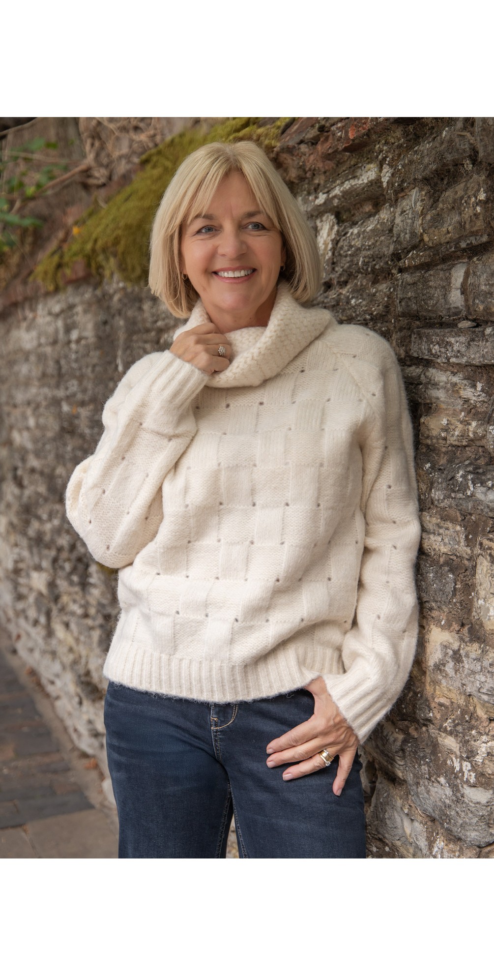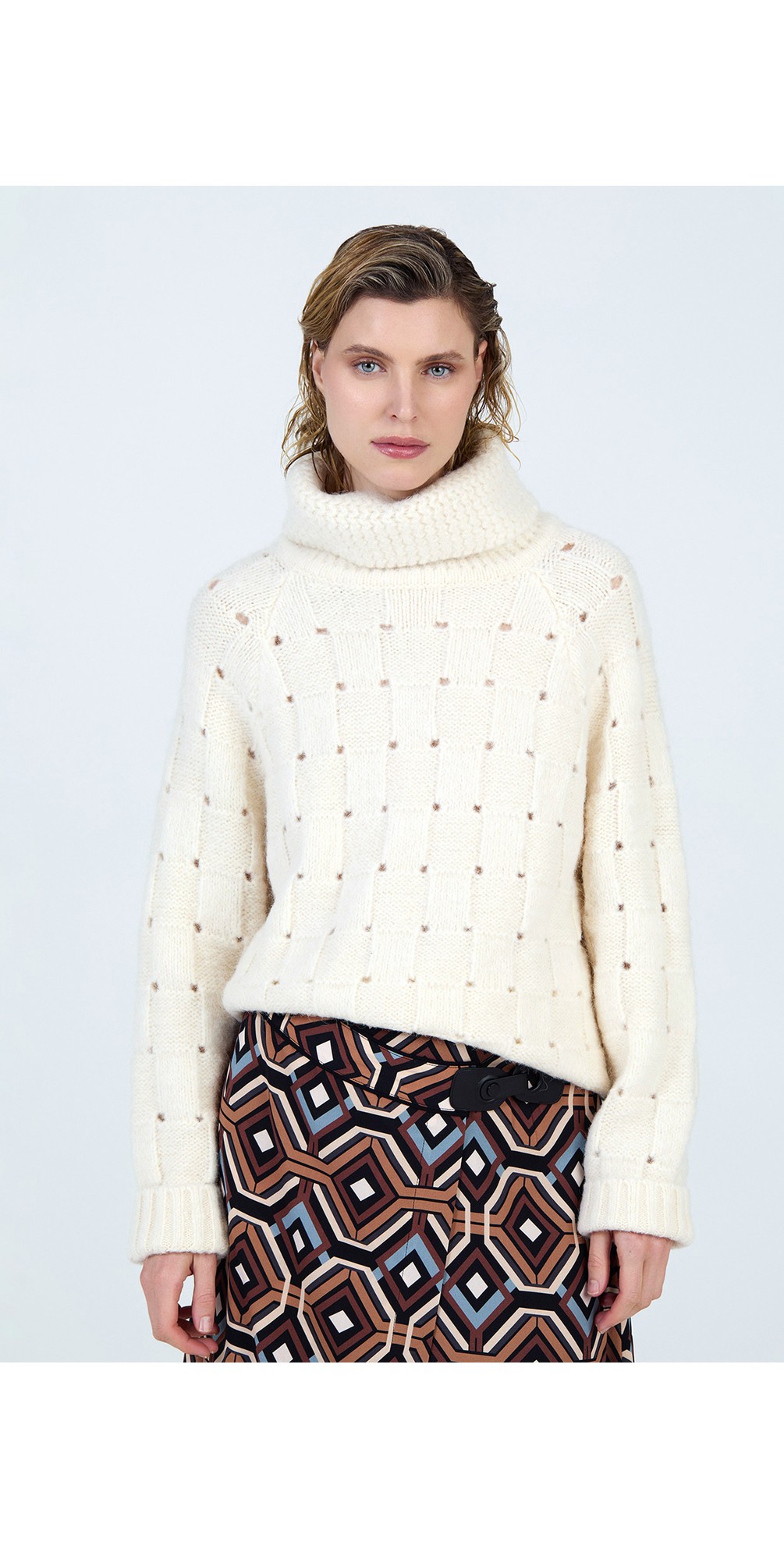 The Weft Knitted Sweater is your new cold-weather essential. Crafted with a cosy high fold-over neck, this knit is designed to keep you warm while offering a refined, modern look. The square-pattern weave adds subtle texture, while ribbed cuffs bring a clean, structured finish. Easy to style and endlessly versatile, this sweater pairs effortlessly with jeans, tailored trousers, or skirts. Layer it under a jacket for the perfect transitional outfit or wear it solo as a statement knit. A wardrobe staple that blends comfort with contemporary design.