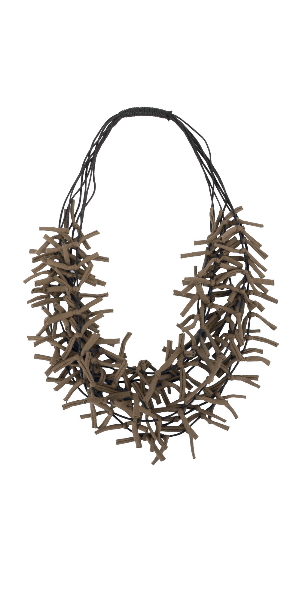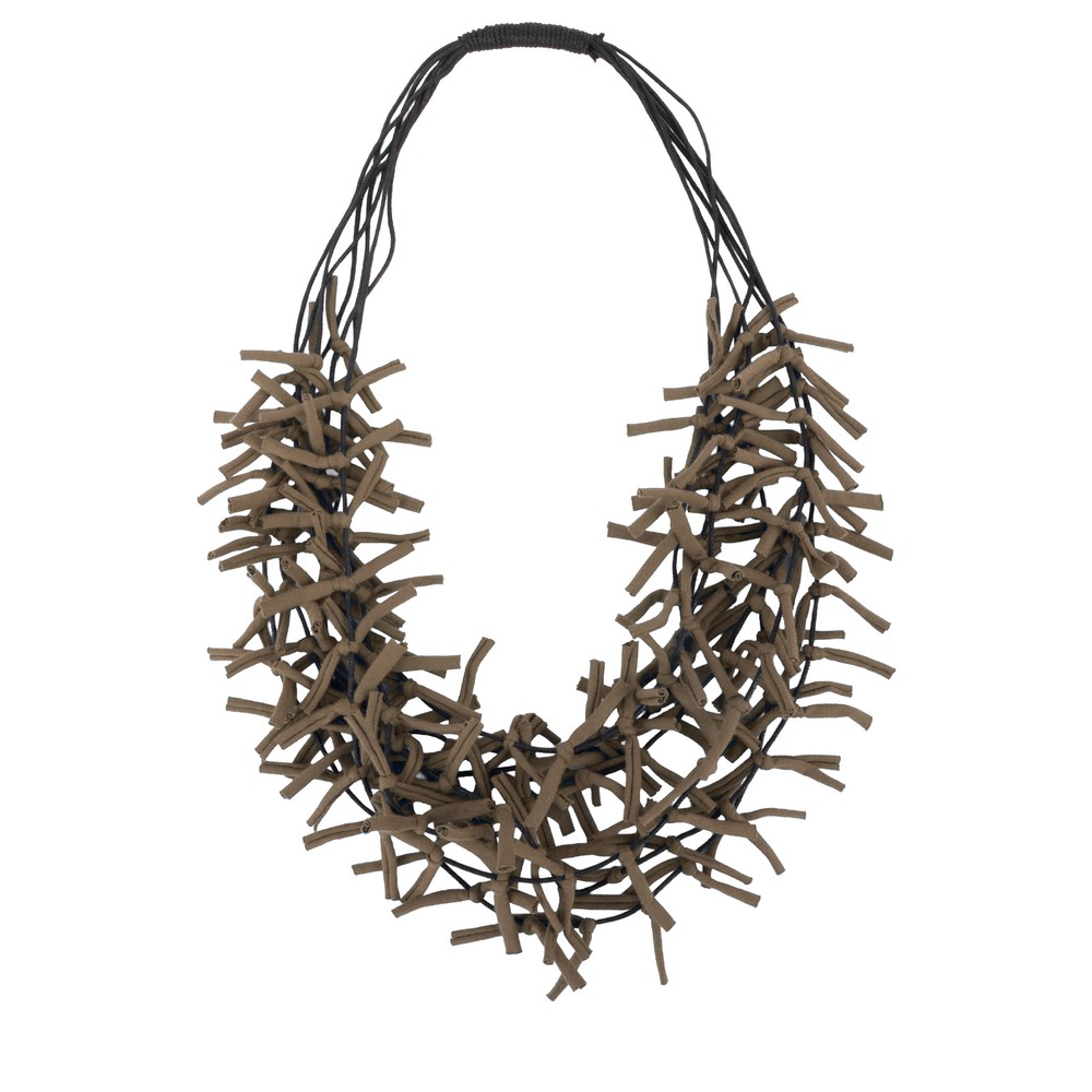 The Knot Multi Strand Jersey Necklace from Suzie Blue is a Lightweight, unique style piece using maaterials such as jersey fabric and wax rope. This fun fabric necklace looks great over a t-shirt or with a dress, and is so lightweight you won't even know you're wearing it!