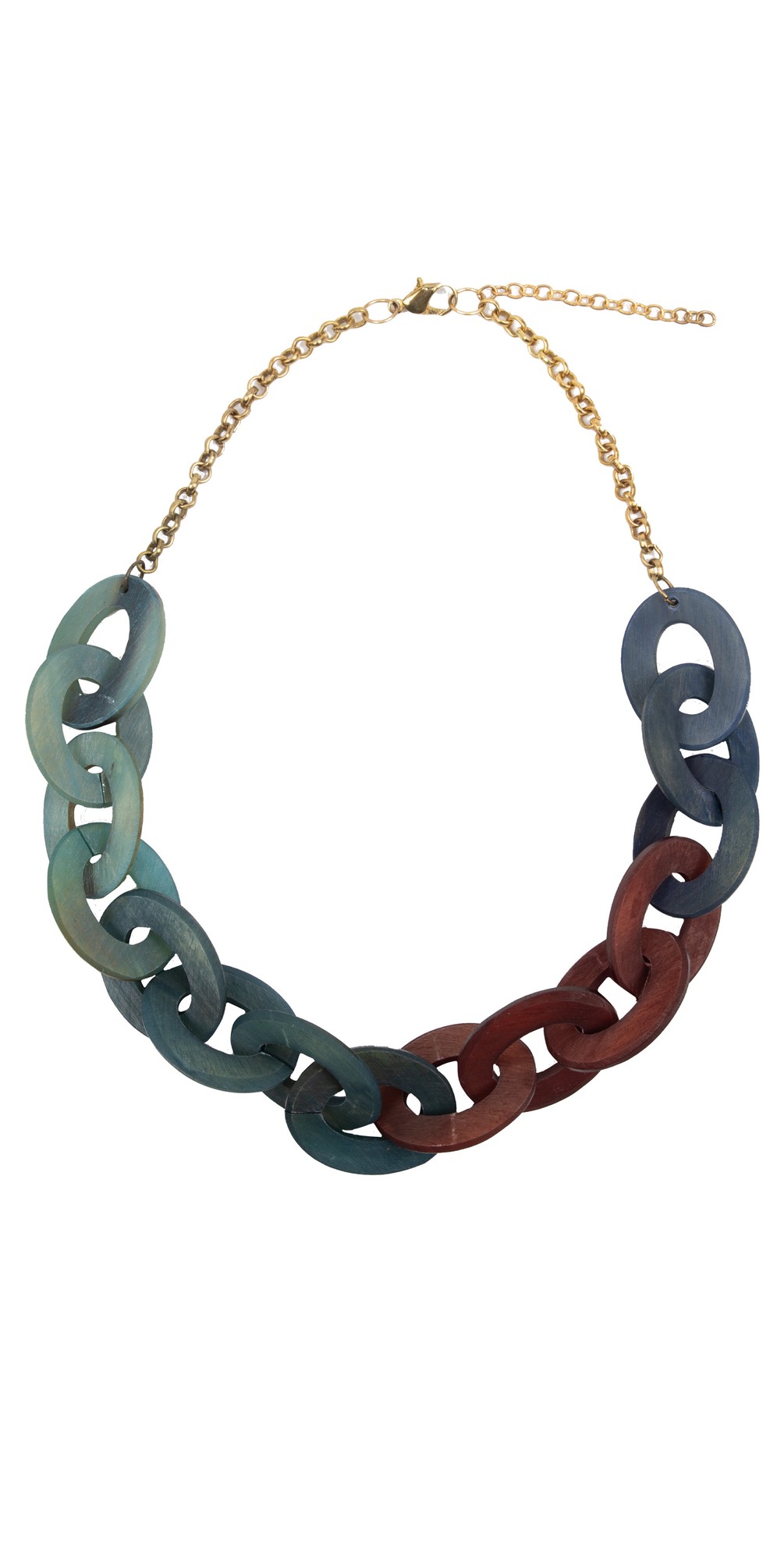 Add a touch of effortless style to your autumn wardrobe with the Suzie Blue Linked Horn Loop Necklace. Designed with beautifully crafted wooden links in rich autumnal tones, this statement necklace brings warmth and colour to any outfit. Perfect for day-to-night wear, it enhances both casual and elegant looks with ease. The adjustable metal chain and secure clasp allow you to find your ideal fit for comfort and style.