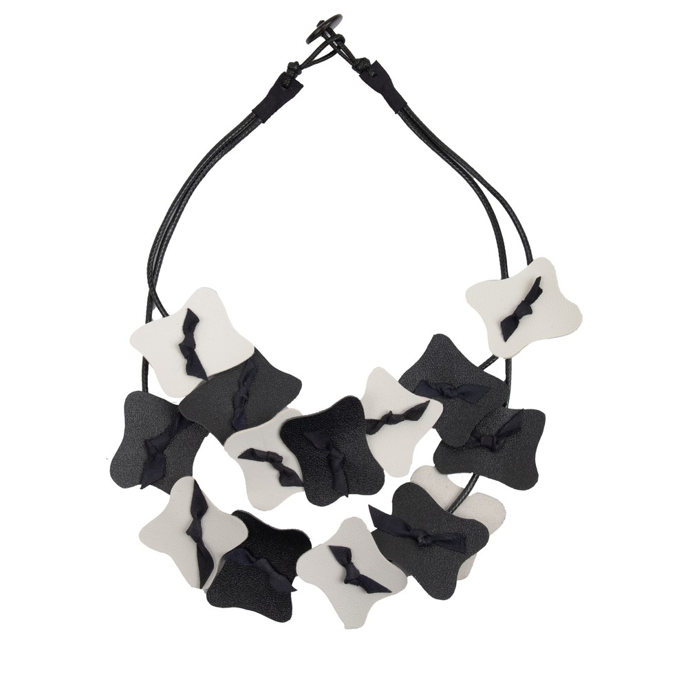 Add a bold yet timeless touch to your look with the Suzie Blue Monochrome Leather Necklace. Crafted from smooth black and white leather discs, this statement necklace combines modern design with effortless elegance. Lightweight and comfortable to wear, it fastens easily with a button clasp and sits beautifully at the neckline. Perfect for adding a contemporary edge to your day or evening outfits, this Suzie Blue necklace is a must-have accessory for any season.